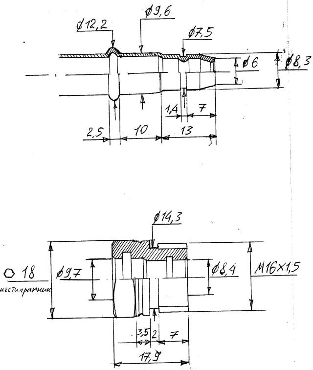 Вверху - штатная трубка высокого давления. Проточка диаметром 7,5мм используется для удержания запорным кольцом. Внизу - штатный штуцер, который на самом деле не штуцер, а скорее футорка. Под резьбовой частью видна комплиментарная проточка, в которой и находится запорное кольцо, а в проточке большего диаметра находится уплотнитель - на разрезе не показаны.