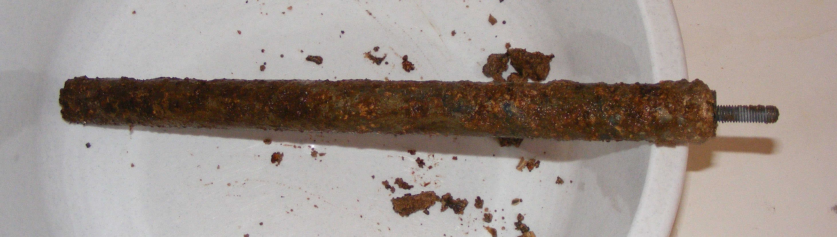 В итоге, оказывается в моей Горенье анод крепится по-человечески - снизу, и М8. Обрадовался что снизу, огорчился что тот что я купил не подойдет, вернее надо чего то придумывать чтобы его на М8 перевести. Но состоянии старого анода окозалось вполне хорошим, я бы сказал процентов 10-20 его износ (бойлеру лет 8, но только один год используем его постоянно, до этого включался на три-четрые недели в году.
