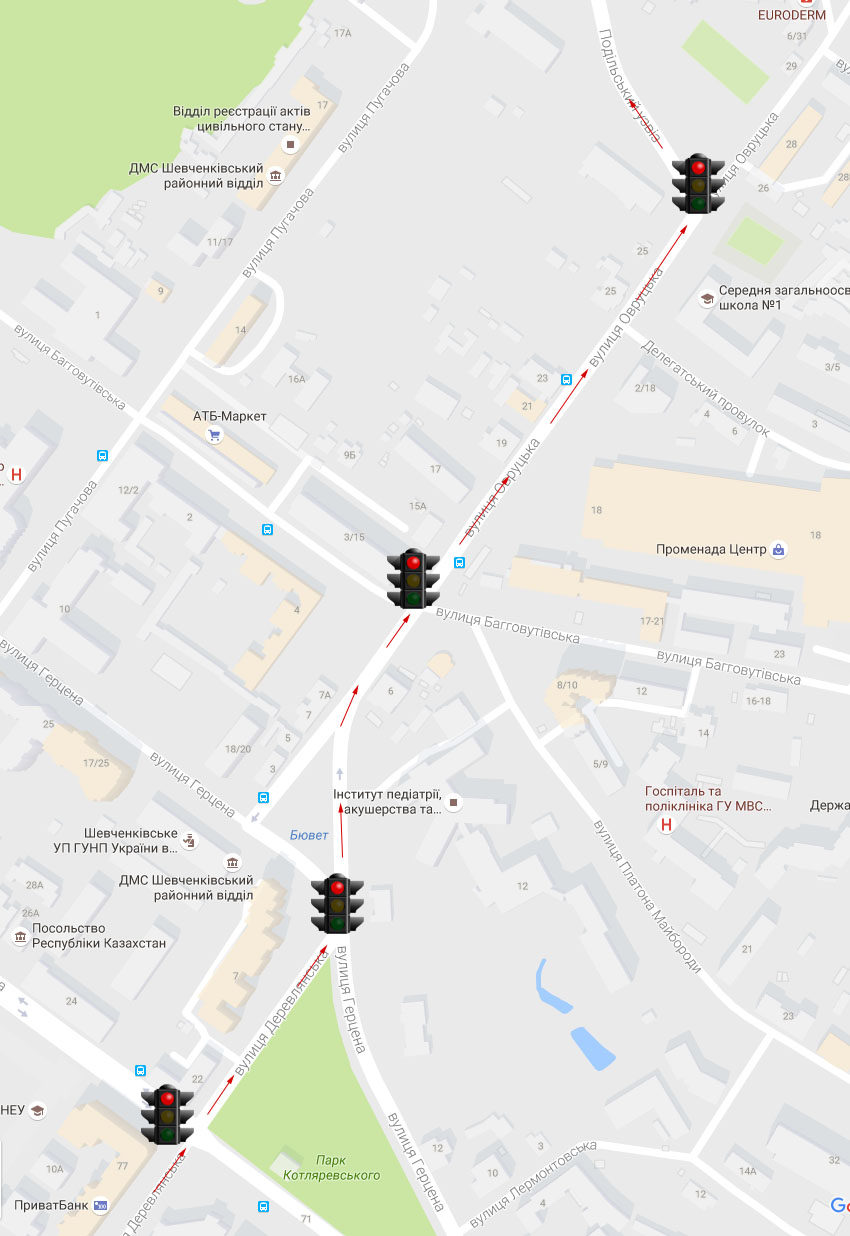 2.5 года ездил по маршруту как на приложенной карте. Когда загорался светофор на Якира (ныне Древлянской) в сторону ПАГа, следующие светофоры проезжались спокойно. Самое поганое - мог постоять на светофоре с Багговутовской.