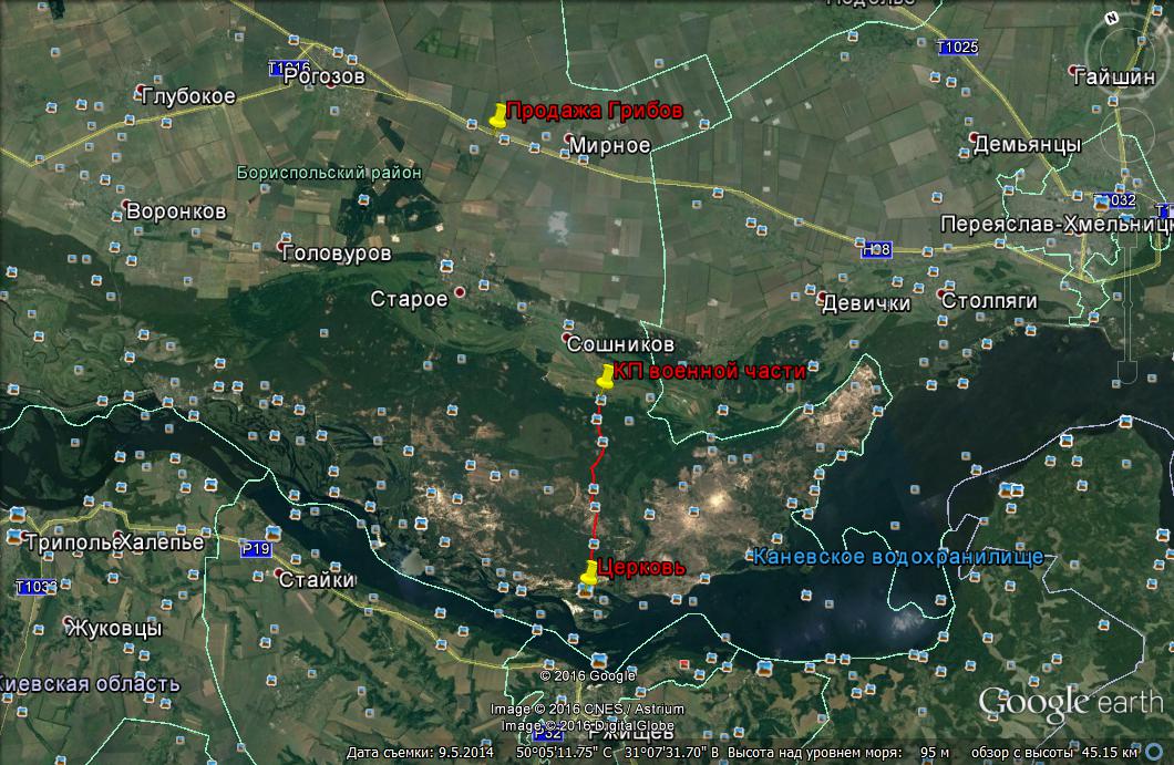 Координаты: 50°0'38.98''N, 31°4'17.64''E Легенда: едем по трассе из Борисполя на Переяслав-Хмельницкий, проезжаем по окружной Рогозов, далее поворачиваем на Васильки. На этом перекрестке обычно торгуют грибами. После поворачиваем направо на Старое, потом Сошников и в конце села необходимо выехать на КП Ржищевского военного лесхоза. На КП выписывают пропуск, дальше уже по GPS по лесным дорогам до церкви.