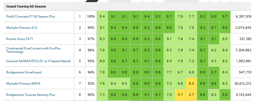 И уже дальше обсуждать как вы не попали в ДТП на всесезонке, как маркетологи вам втюхивают супер-пупер резину и т.д. В приложении рейтинг резин, моя на 8м месте из 41. Летом и в дождь резина во Зимой, по сравнению с хорошей зимней резиной это не резина вообще. И класть на полный привод и ESP.