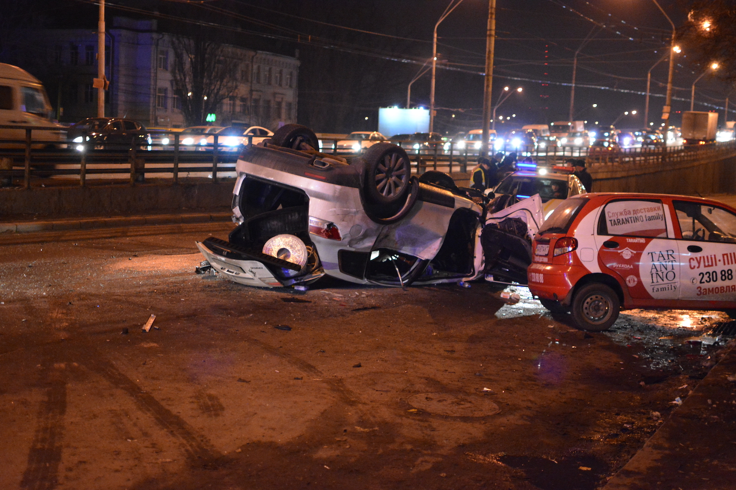 В сторону центра, справа от эстакады у м."Нивки", произошло где-то перед 21.00. Температура — -1°C, но дорога сухая. Похоже, горе-каскадёр слишком поздно решил, что ему надо не на эстакаду, а правее. Ограждение эстакады заметно повреждено. Наиболее впечатлил хвост из зевак, едущих по эстакаде в другую сторону.