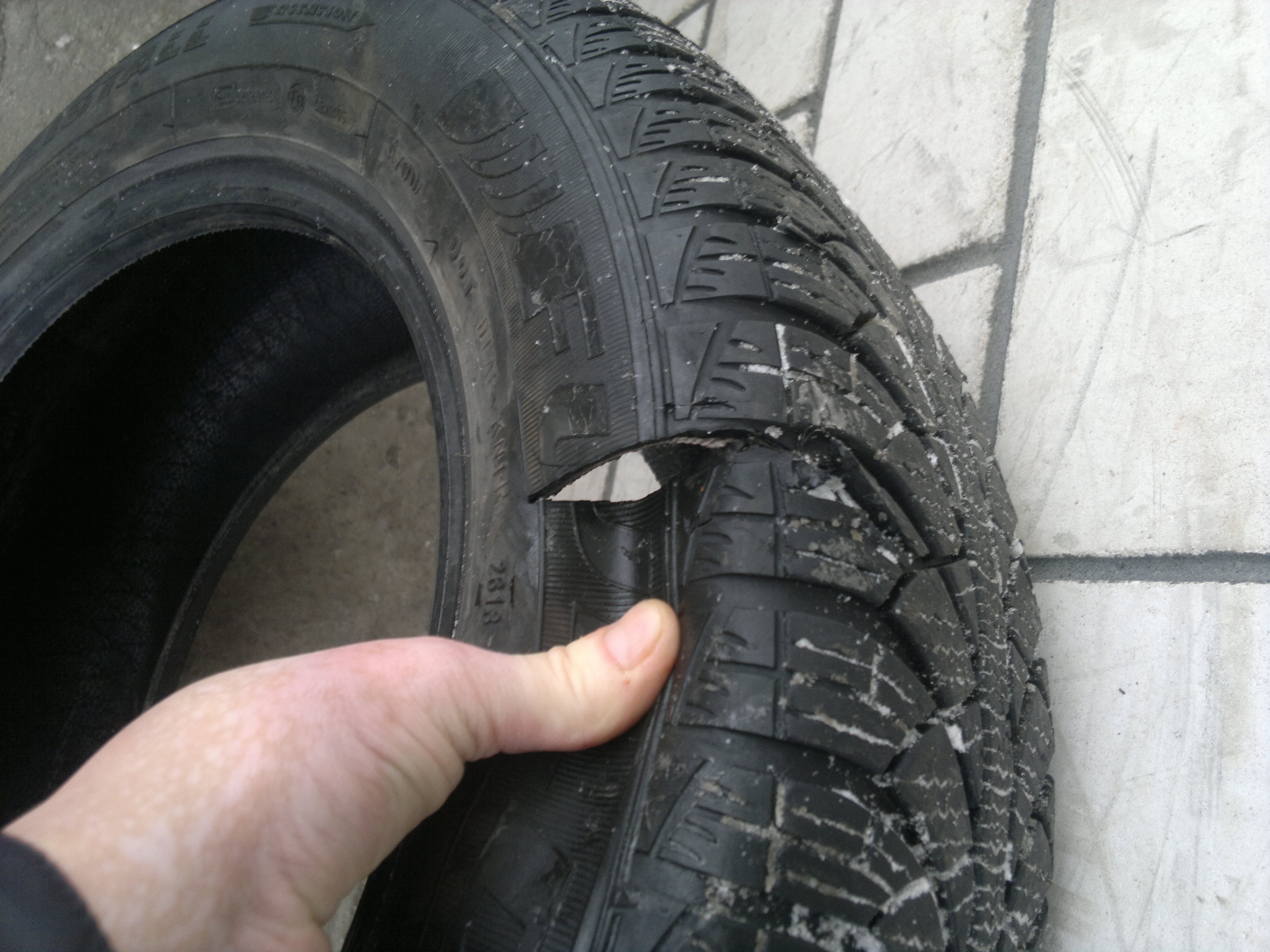 Резина пострадала в результате мелкого дтп. Решили на месте, без вызова копов. Виновник дтп настаивал на том, что резину можно "сделать", но я настоял на компенсацию, замена на новую. Вернул всё деньгами. Как то так. ПС. Резину при шиномонтаже оставил там же, то есть в утиль.