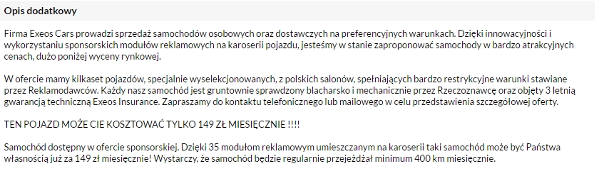 апд: на их сайте нашел Вы хотите , чтобы начать зарабатывать деньги на мобильную рекламу, но вы не имеете свой собственный автомобиль? Решите , чтобы купить автомобиль с спонсорский контракт , и заработал каждый месяц 666 злотых будет в состоянии потратить на его погашение. Это легко!