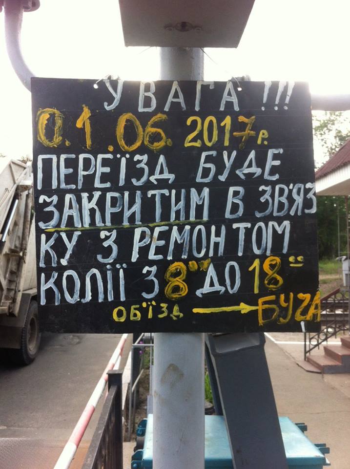 На час виконання ремонтно-колійних робіт на переїзді пропуск автотранспорту буде здійснюватися через переїзд 31 км залізничної колії станції Буча.