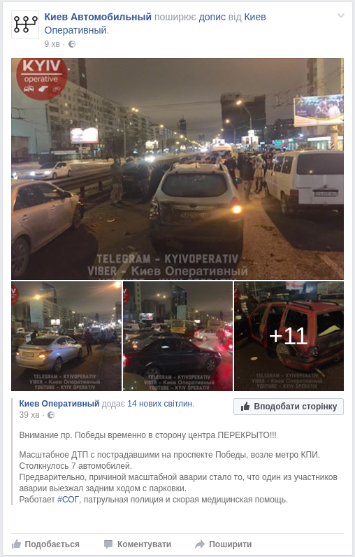 Масштабное ДТП с пострадавшими на проспекте Победы, возле метро КПИ. Столкнулось 7 автомобилей. Предварительно, причиной масштабной аварии стало то, что один из участников аварии выезжал задним ходом с парковки. Работает #СОГ, патрульная полиция и скорая медицинская помощь.