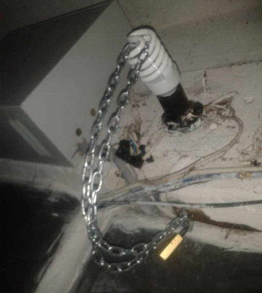 спиральная энергосберегайка, через нее велозамок, и кольцо в стену на анкерах со спиленными шлицами. Малейшая попытка стырить лампу приводит к ее поломке.