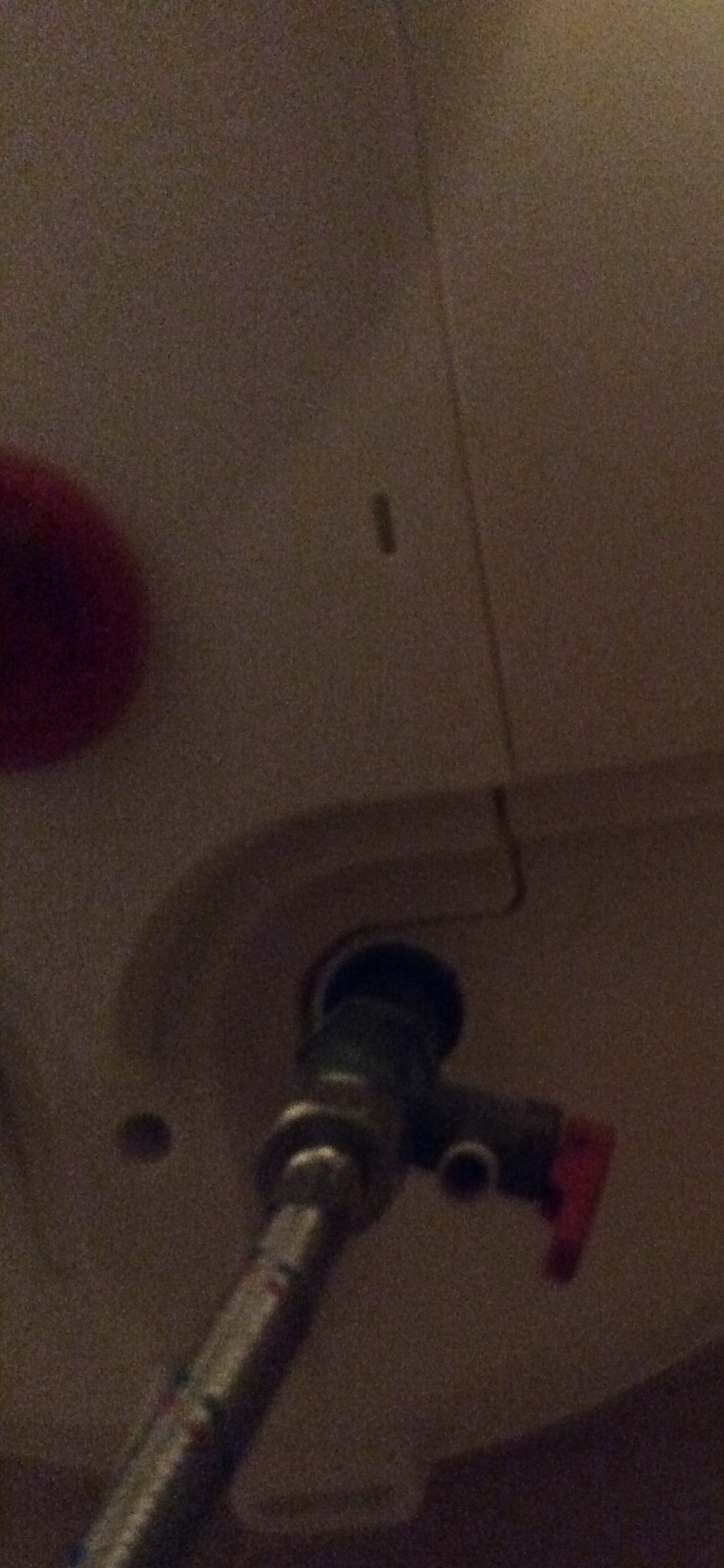 отой червоний ричажок потягни пальчиком легенько. тільки підстав ємність бо повинна побігти водичка.