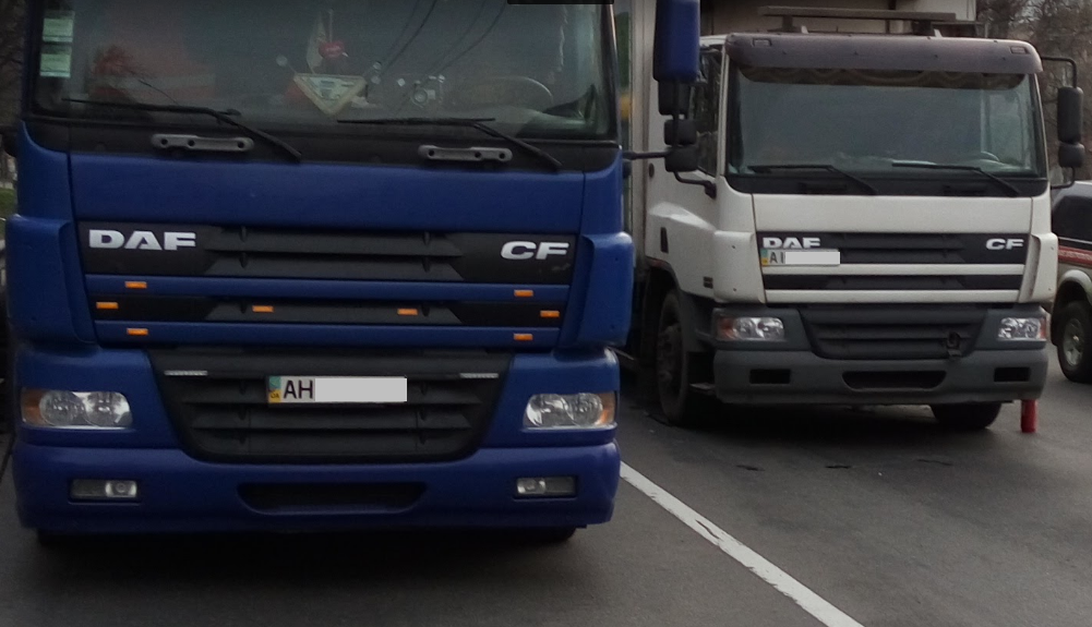 У меня есть фота Донецкие белые номера у фуры DAF. ЧСХ и второй грузовик - тоже DAF Траллики стояли так как рога не позволяли объехать "инсталляцию" За ними, кстати, приезжал тягач и одного оттуда вытащил при мне.