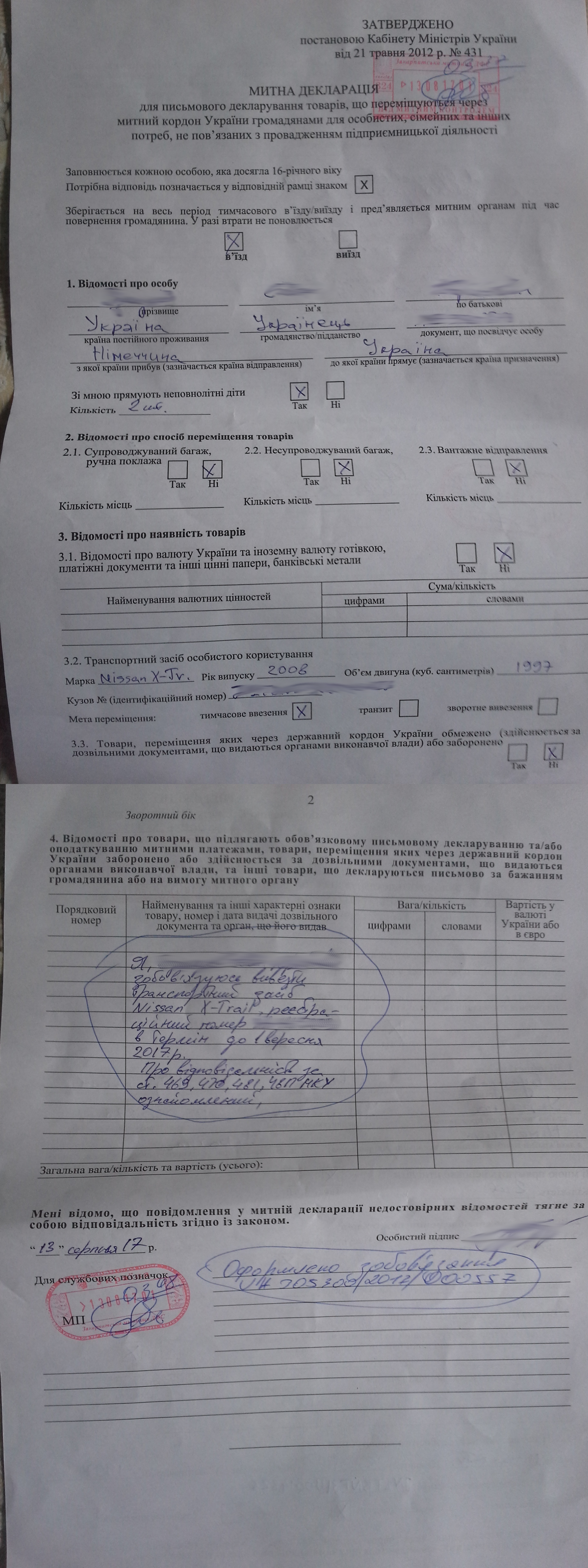 если кого сюда гугл заведёт - бумажку сначала надо заполнить, поставить на ней штампик при въезде и потом её же сдать при выезде. И при всём этом нужен внутренний укр. паспорт. т.е. его надо предъявлять при заполнении и при сдаче. Ну и штамп ВНЖ в загране нужен тоже. Если распечатаете и заполните декларацию заранее будет часа на пол быстрее - сначала искали нужный бланк, потом образец и проверяли ещё полчаса.