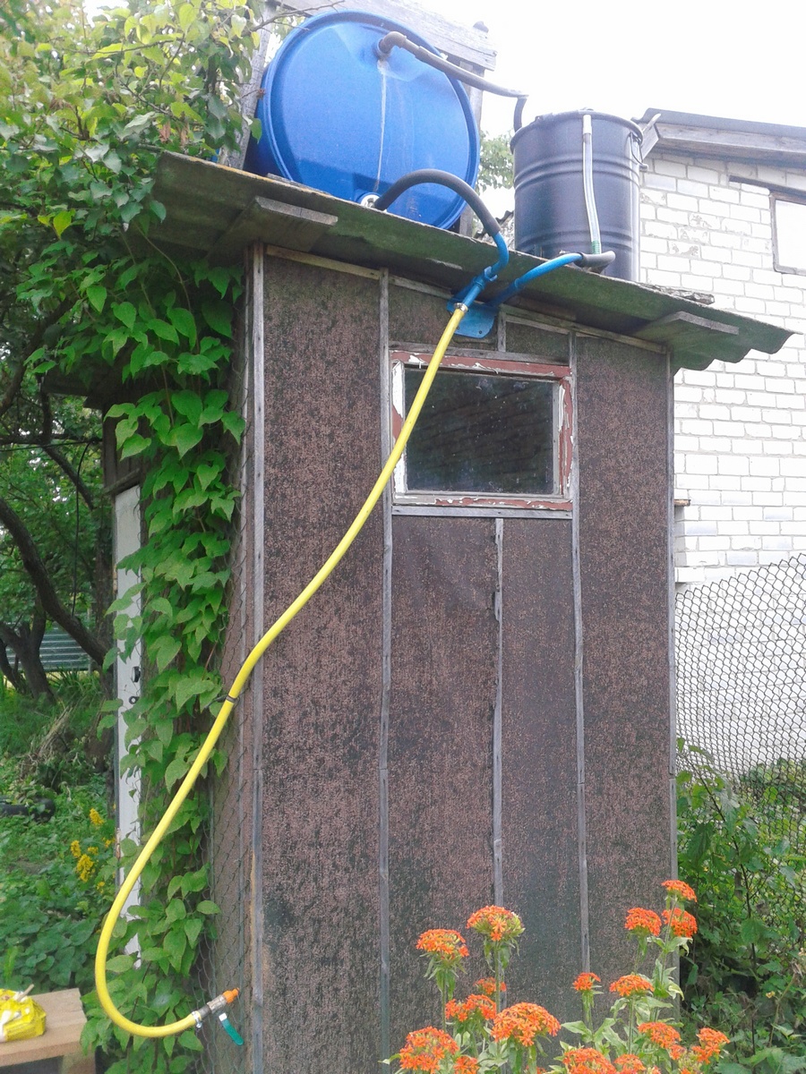 Сварен каркас высотой с туалет, больше 2м, лейка вкручена прямо в бак на небольшой трубке и до лейки от головы еще есть место. Льется не так чтобы сильно, получается только давление самой воды, но помыться нормально, уверенные струи.