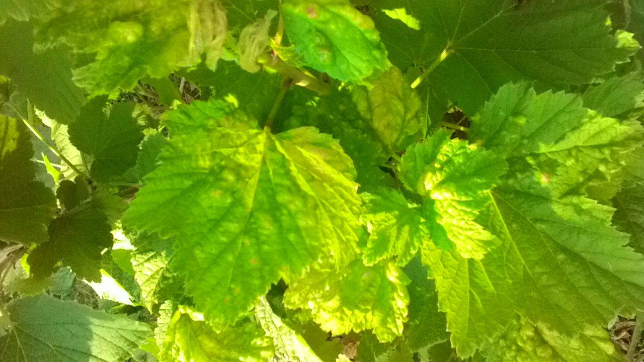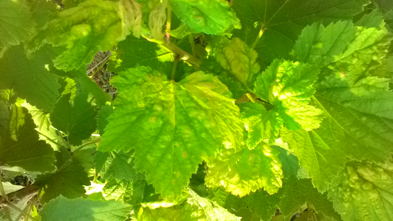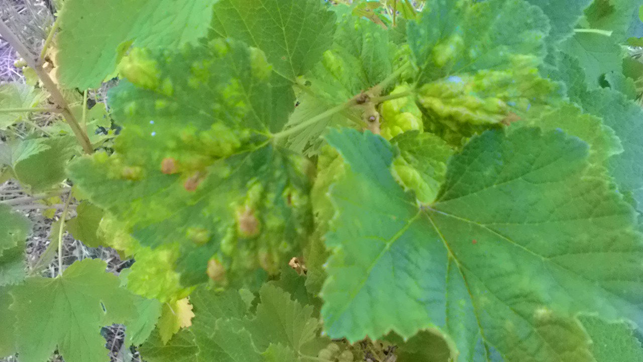 В далёких восьмидесятых, до эпохи химии на огородах, было очень похожее состояние листов смородины (только цвет вроде не теряли, а просто "вздувались") из-за подрывания кротом корней смородины.
