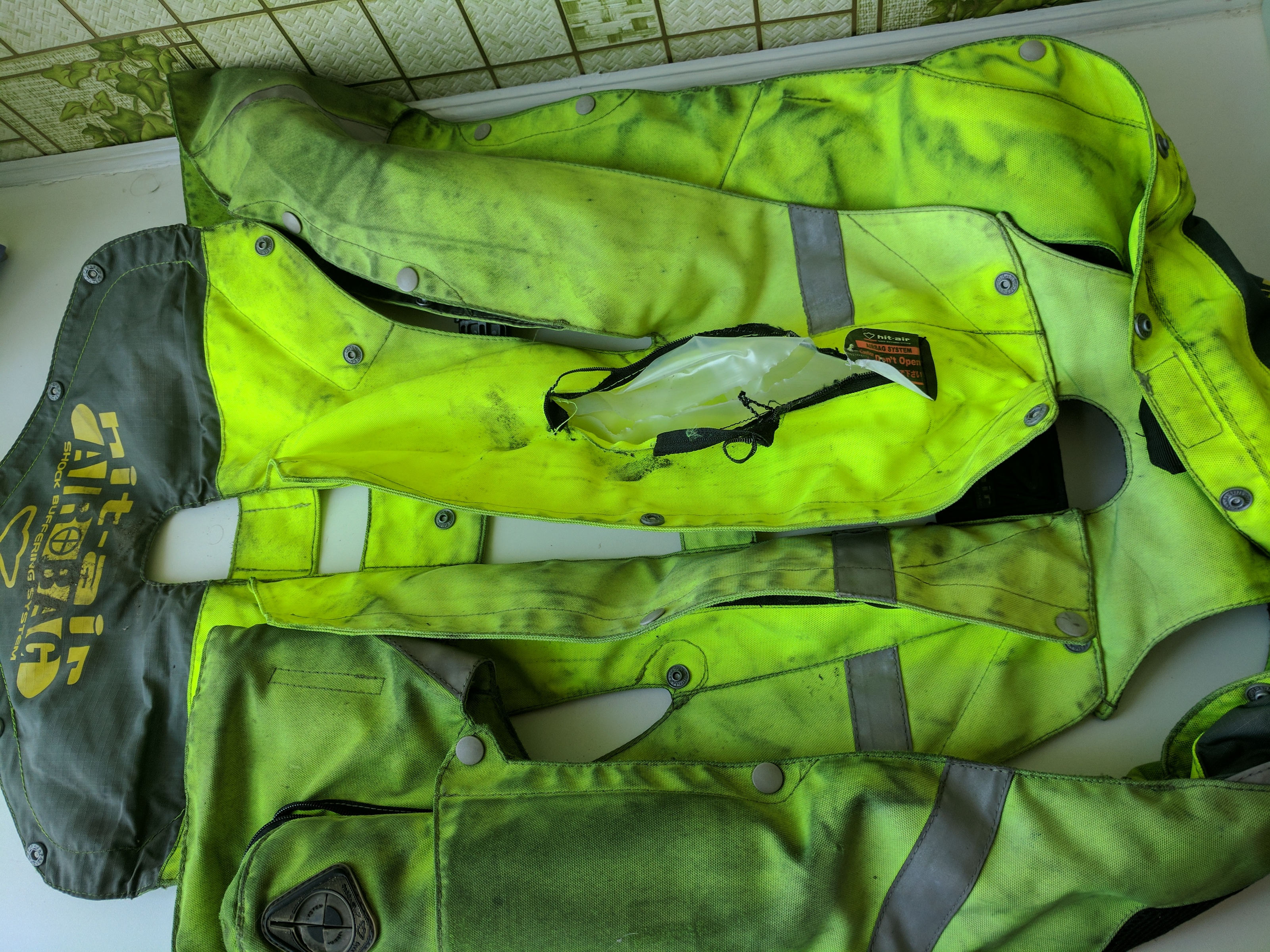 У цієї конкретної моделі (Hit-Air MLV) є недолік - два технологічних вирізи ззаду-збоку, я так розумію через них на фабриці подушку кладуть всередину. Вони закриті блискавками і потім клапаном на кнопці ще зверху. Коли подушка надувається, клапан відкривається, щоб дати їй місце і блискавка стирчить назовні. Я проїхався прямо на одній з цих блискавок, уже після удару. Блискавка роздерлась об асфальт і розрізала подушку. Більше ніяких пошкоджень на жилетці немає, але так, жилетка капут.