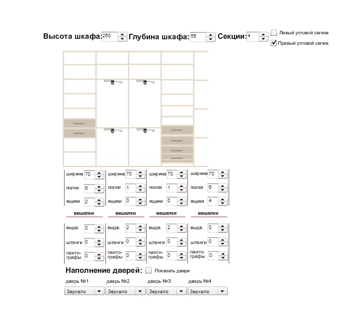 вставлю и я свои 5 копеек. Делал аналогичный шкаф лет 5 назад. Длина 2,6 м. Так я ни смотря на уговоры сделал 2 зеркальные двери вместо 4. До сих пор доволен. смотрится намного интересней. Тем более как раз по конфигурации наполнения ТС подходит.