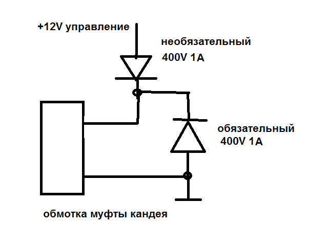 диоды 400 вольт 1 ампер типа 1n4007 , то не резистор , то сама муфта , верхний диод не дает обратному броску пойти в сторону акб , тот который параллельно гасит его на обмотке ...