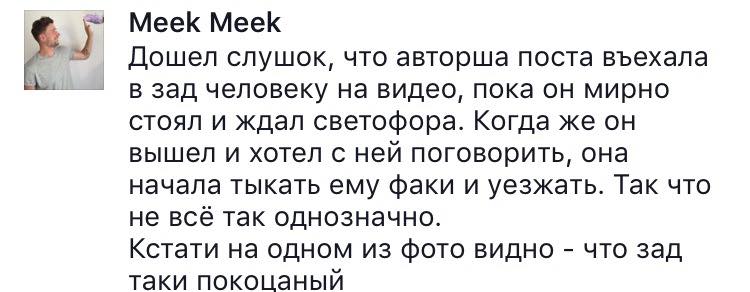 Зрозуміло, що пані цьоця приховує немало. І там в коментах писали, що тіпо вона в нього в'їхала, бо фтикала, розмовляючи по телефону. Тоді закрилася, факи тицяла і вапше намагалася втекти. Теж, мабуть, перебільшення. Але істина десь посередині.