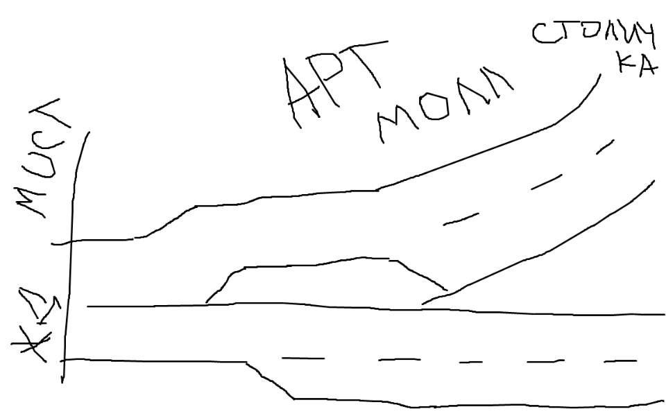 Откуда у вас информация про аварию с заездом в тц, машины стояли уже за "под мостом". Если движетесь по дороге к месту примыкания спуска с моста, на которой нет знака уступить дорогу и у вас помеха слева(на спуске знак главная и знака движение только прямо нет), вы будете уступать. О разметке я молчу, если спускаетесь с моста в левом ряду согласно разметке попадаете в тупик. П.С. Провели дискусию, поговорили, а толку "ноль", тем кто занимается дорогой это все не ведомо.
