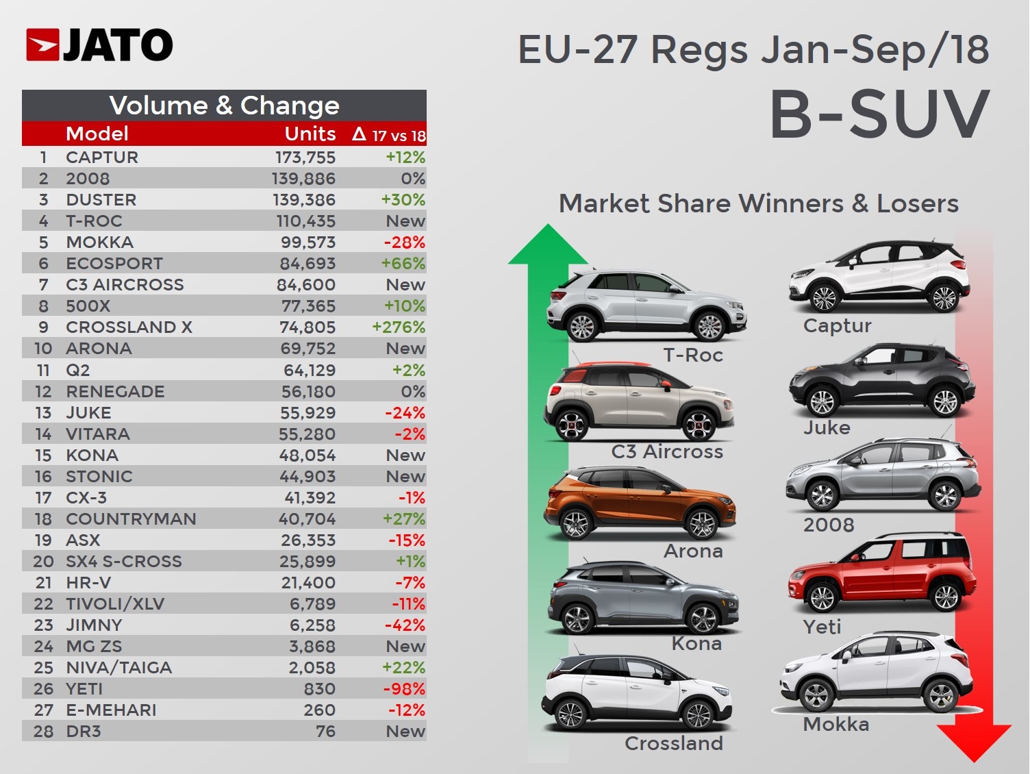 хотя ещё по делению Jato 2018 года Q2, T-Roc и Arona относились к сегменту B-SUV, а Q3, Tiguan, Ateca и Karoq относились к C-SUV.