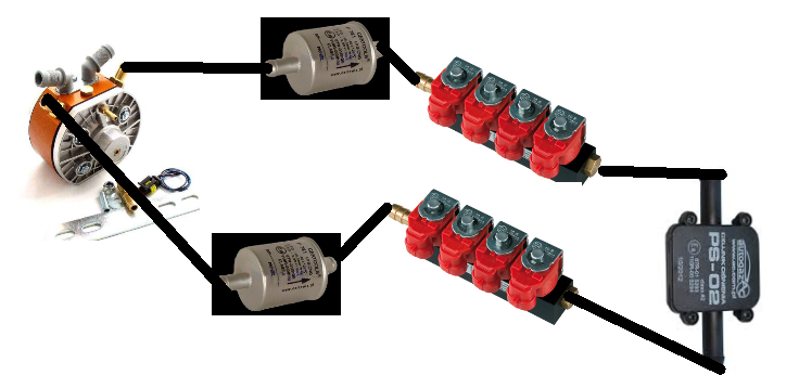 выход 1 - фильтр - форсунки - мап -форсунки - фильтр - выход 2 ( кольцо получается )