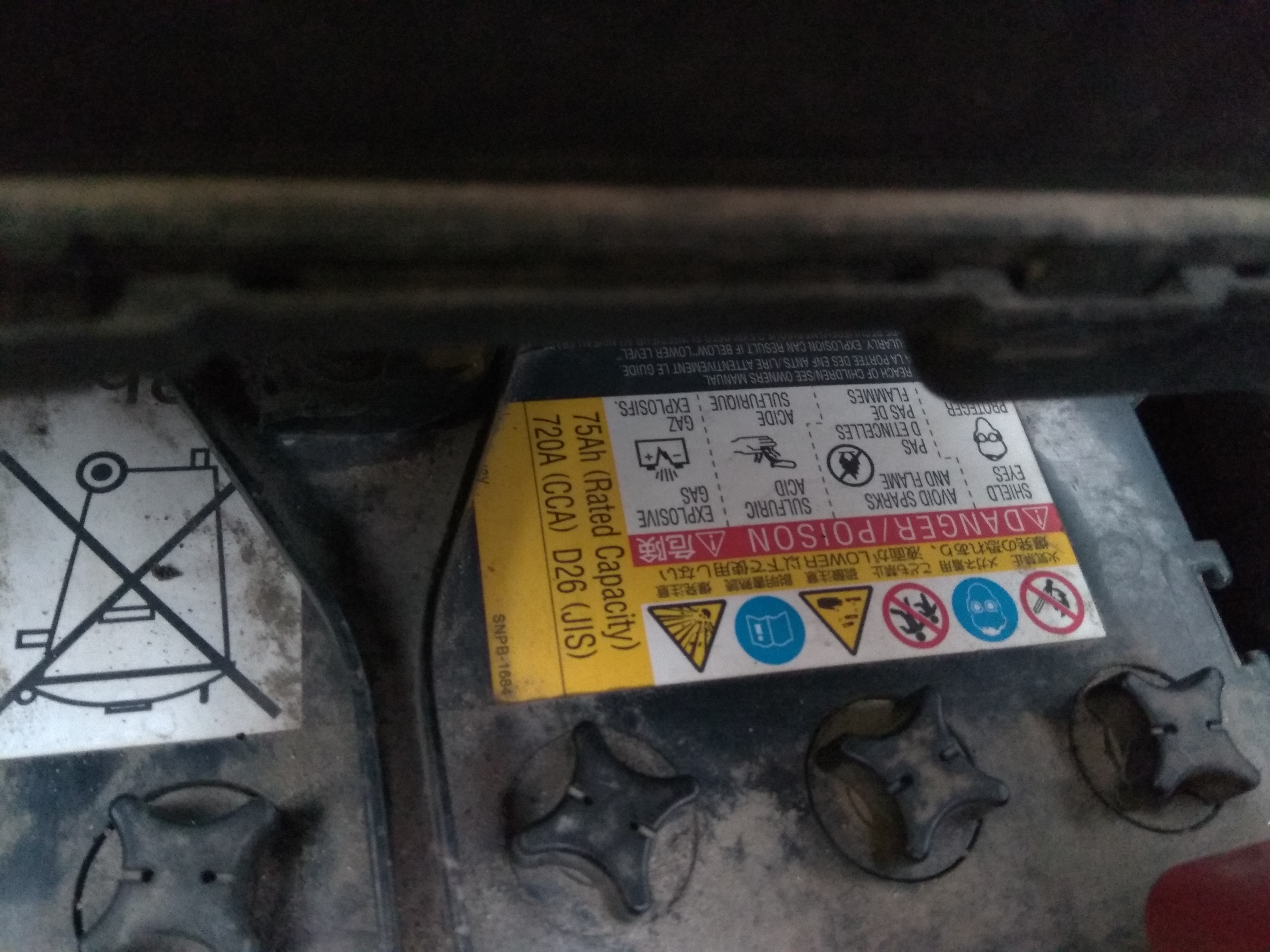 Собственно вот стоковый на 75 часов в Ниссан Мурано 2012 года. Неужели япошки ставят обслуживаемые аккумуляторы в свои авто??? Эти барашки для того чтоб подливать дистилят?