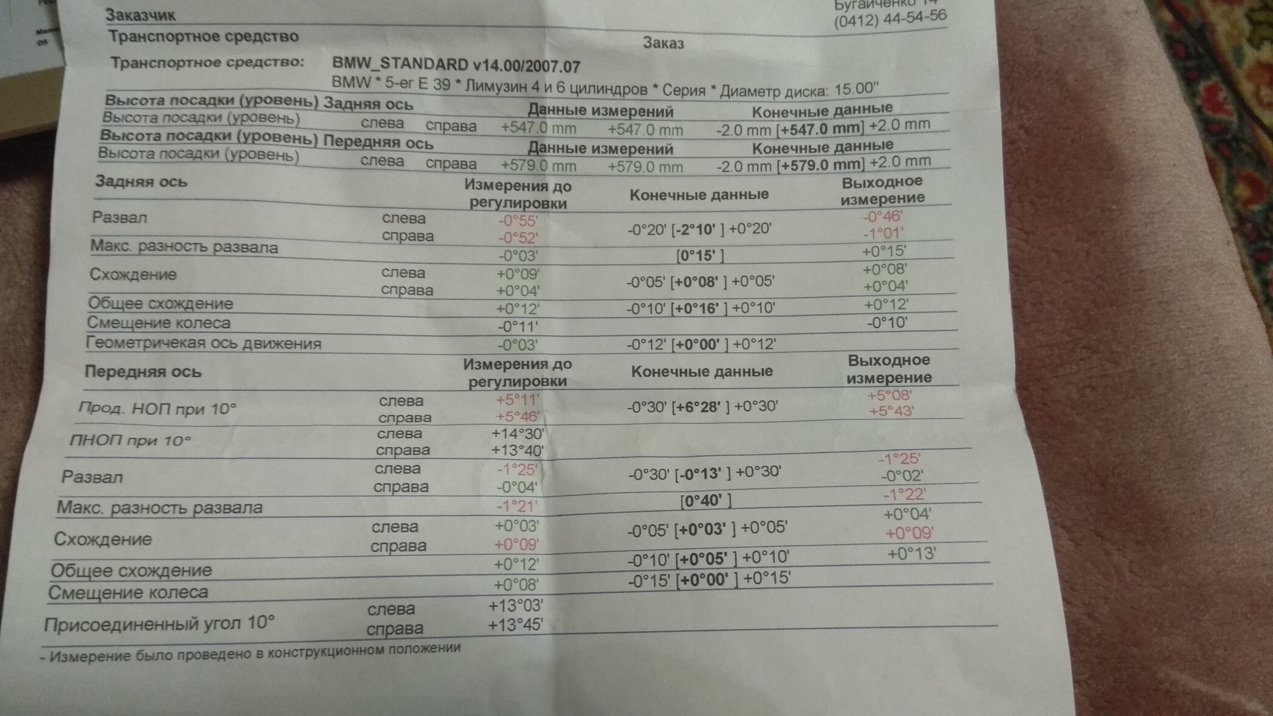 Недавно делал данную процедуру и вот что получил(см. Фото). На сто сказали, что нельзя сделать развал переднего левого колеса, а на вопрос почему ответили: скорее всего, у Вас что то там согнутое, я смотрел, по ходовой все нормально. У меня, может где то диски передние не совсем круглые(ямки ) Недавно была авария, только удар в зад был. Я в этих делах совсем не разбираюсь. Может такое быть и что делать? [изображение]https://ibb.co/hqwkNG[/изображение]