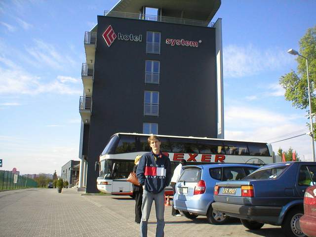 гостиница system. стоянка платная (по-моему 5 злотых) . большая новая,но на краю города. я пожертвовал пивом, чтобы в центр доехать на машине.