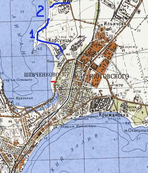 Реально я ездил в сквозную от №1 до №2, но там протока шириной около метра и легковушка не пройдет. Лиман очень мелкий в тех местах. Летом можно вброд перейти на другой берег (по карте около 3-х километров).