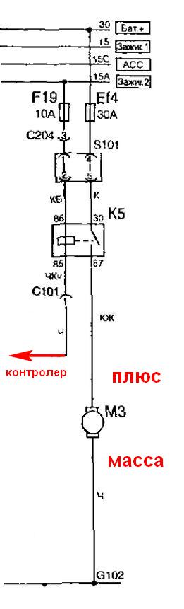 На реле К5(схема выше) имеется клемма "85", ее нужно замкнуть на массу, предварительно разъединить "С101". Включить зажигание. При этом должен включиться вентилятор. Если вентилятор не включается, то неисправно реле К5. Тогда перемыкаем клеммы "87"+"30".