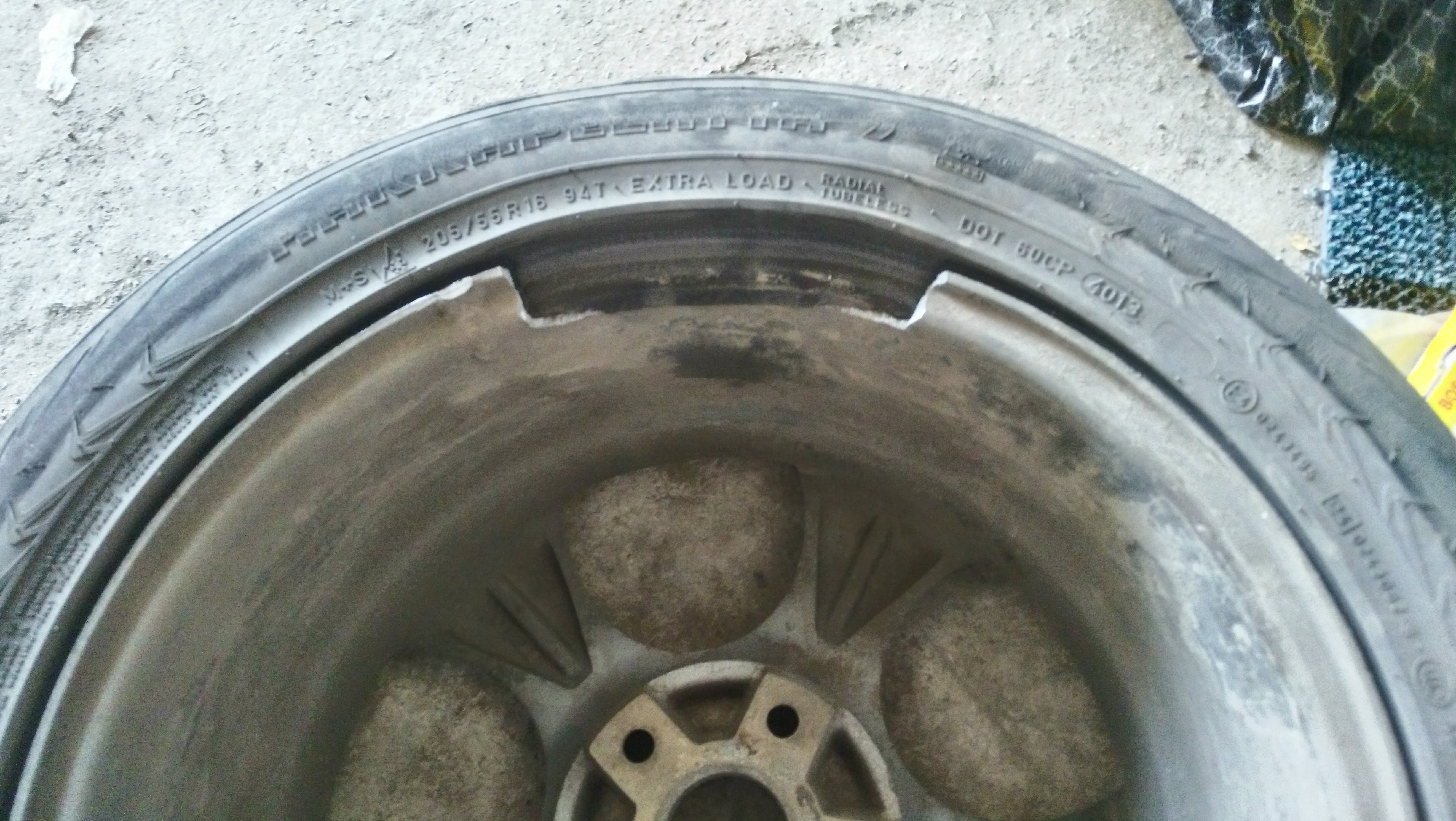 Давление было 2.5 Но думаю, что я попал на краешек ямы именно диском, поэтому покрышка осталась целой