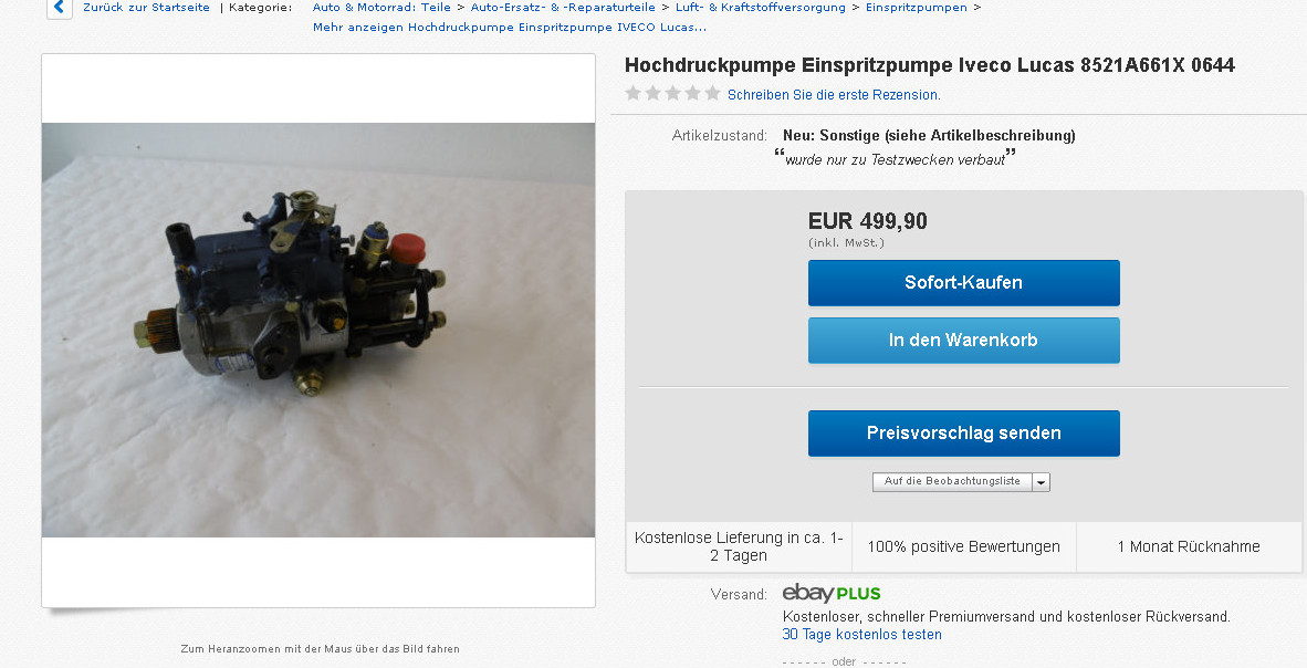 В связи с горящим сезоном в сельском хозяйстве возникла необходимость быстро доставить с Германии топливный насос на опрыскиватель Берту. Как оказалось там стоит двигатель Iveco с топливной LUCAS 8521A661X 0644 Такой новый насос нашелся на Ebay - https://www.ebay.de/itm/332633690924?&_trksid=p2349526.m4383.l4275.c2&autorefresh=true Но немцы на мое ломанное письмо через переводчик с просьбой отправить через DHL в Украину ничего не ответили.