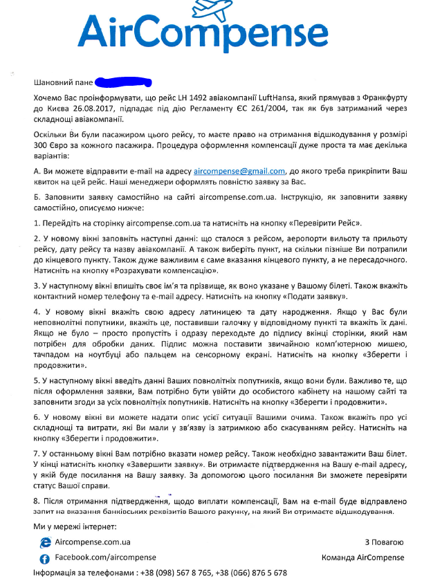 Вчера обнаруживаю в почтовом ящике письмо от киевской конторы "эиркомпенс" (откуда узнали адрес регистрации - хз)