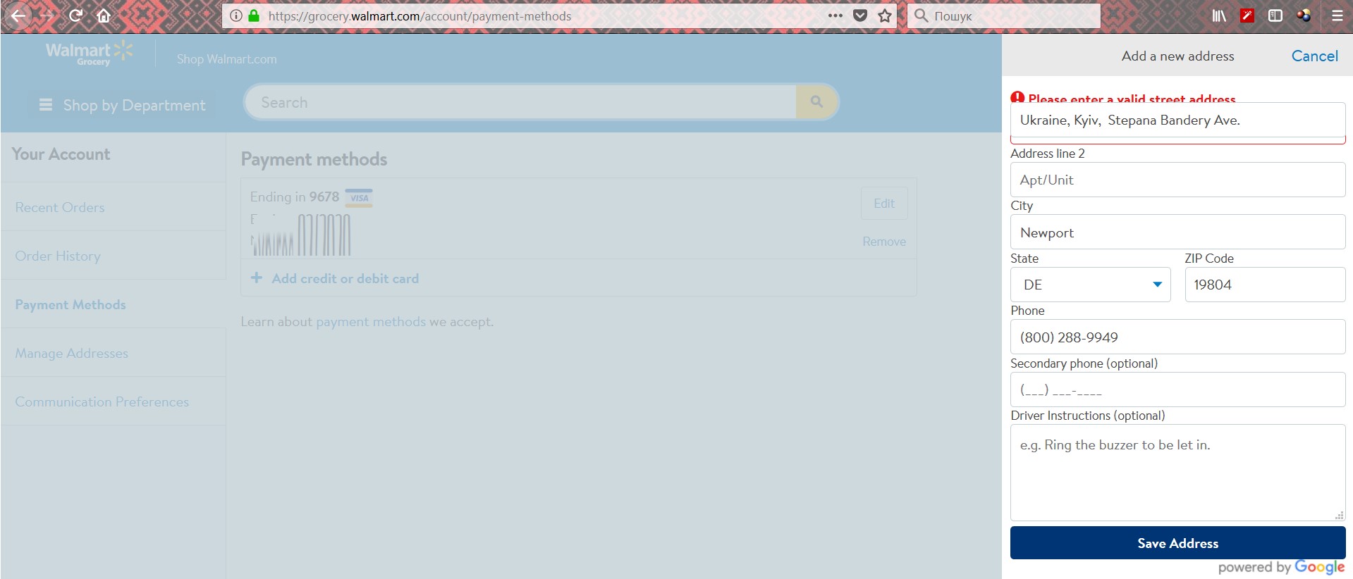 Ктото имеет опыт покупок в Волмарте? Пытаюсь заказать на адрес Миста в Делавере, несколько раз реджектят заказы((