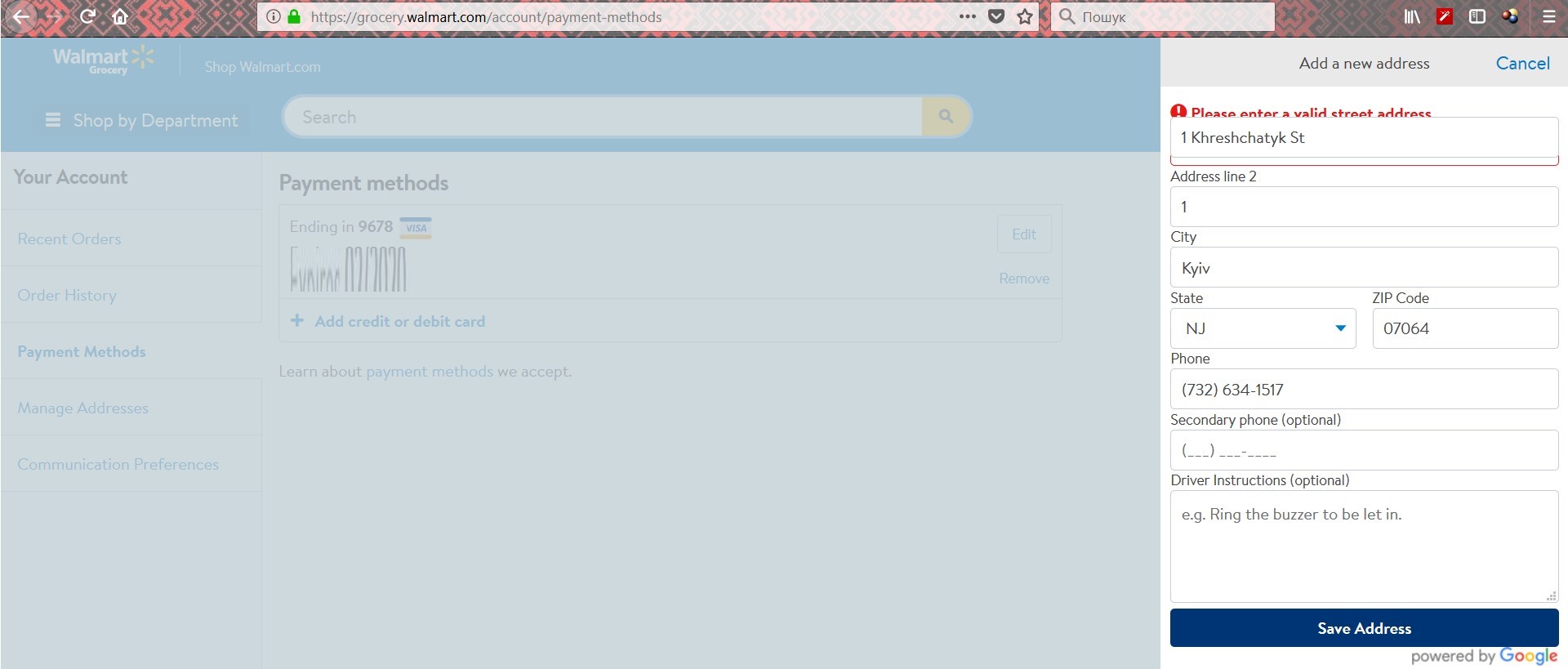 И сколько лет этому "ответу на 1м из форумов покупок"..? С тех пор много чего поменялось. Сейчас в Payment methods Billing Address может быть только американский. Любая попытка ввести в Address line 1 неамериканский Street address не проходит. Смотрите скрины. У меня срок действия карты, прописанной на Walmart, заканчивается в этом месяце, а пробный заказ с новой сразу отменили. Вот я и пробую варианты...