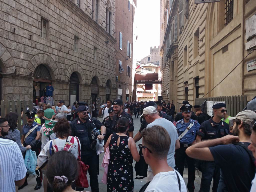 Посмотреть это палио можно или прикупив местечко на балконе какого-то здания, выходящего на площадь, или на специально установленныъх для этого местах, или совершенно бесплатно, прямо на площади, если конечно имеется достаточно терпения и физической выносливости. Прийдется прийти очень заранее, пока пускают и пару-тройку часов ждать действа в толпе таких же любителей экономии и местной молодежи. Мы как раз так и поступили. И как водится когда ожидается большой наплыв народу задействуют и дополнительно полицию и всяких прочих карабинеров, видел несколько автобусов
