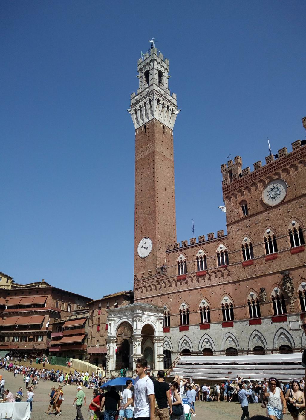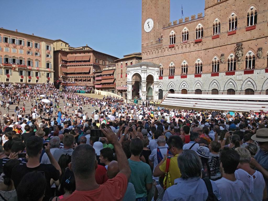 Обитатели Сиены не очень приветствуют нашествие туристов на это действо - говорят это их местные разборки и нефиг тут гостям делать. Уже с утра полно народу с повязаными на шее платками контрад. Говорят так можно ходить только в дни проведения палио. Хотя этим они создают как-бы дополнительную рекламу мероприятию. А поскольку тутошний самый древний в мире банк, с которого город неплохо так жил, недавно скандально обанкротился, то туристы становятся основным источником доходов.
