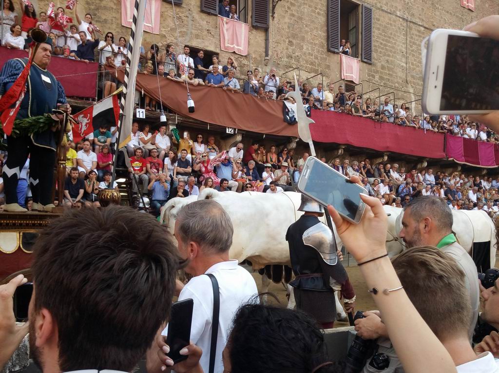 Длится предшествующая гонке церемония примерно час, а затем на повозке запряженной четверкой белых бычков вывозят собствено палио (такая разрисованная простыня), за который и бьюься. Простыня эта так себе - не впечатляет, а вот бычки - да! На вид это уже слоники, 100% каждый весит больше тонны. Такая местная порода - razza chianina, которую кстати потом в латинскую америку завезли, и с которой вся лучшая говядина и пошла.
