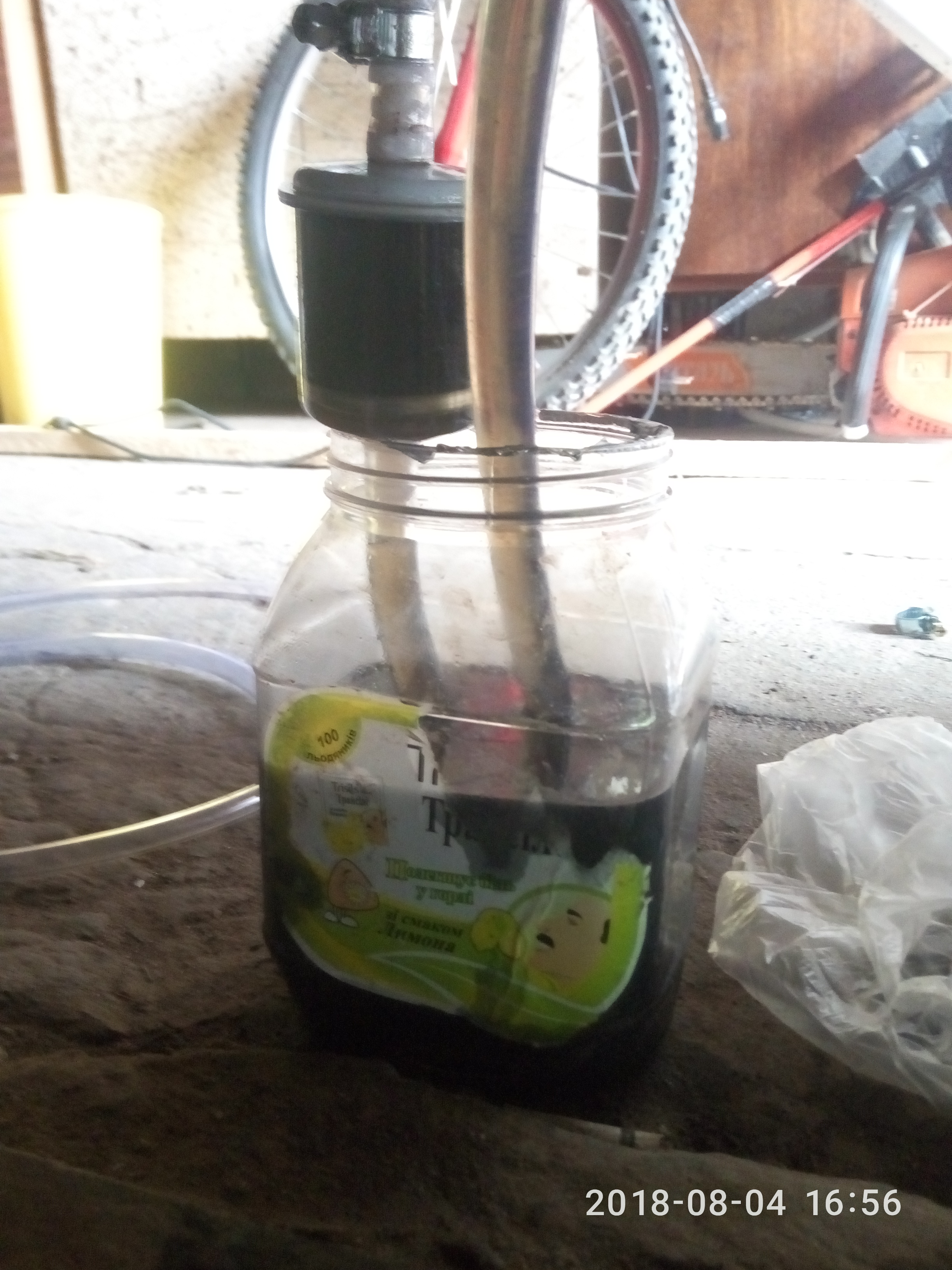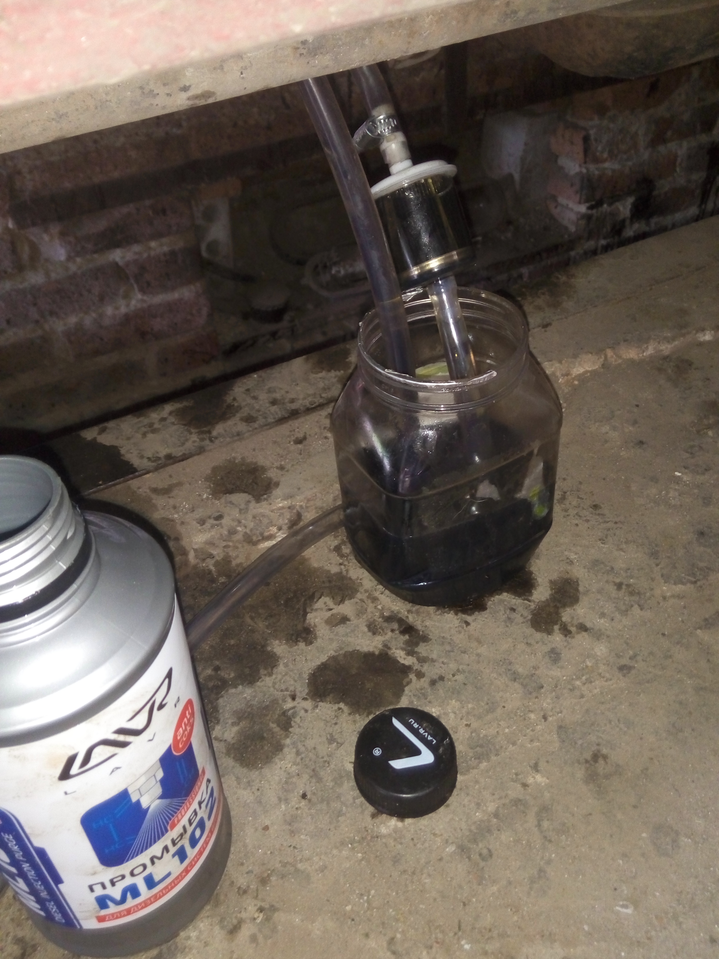 Мои результаты чистки дизфорсунок. Я честно в шоке! После подключения своей«установки» и после того когда завел двигатель, я увидел нечто. На фото видно. Не понимаю грязные форсунки, но это капец .Вся жидкость из прозрачного превратилась в черную жижу. Но не смотря на это я полный цикл прошел.