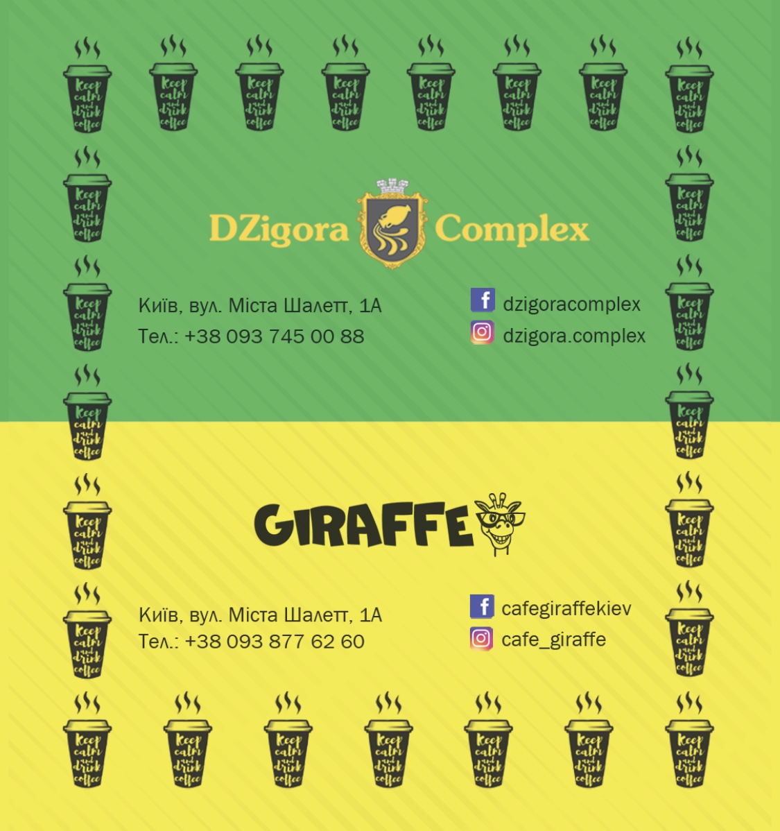 Предлагаем Вашему вниманию новое кафе GIRAFFE, которое расположено в здании автомобильного комплекса Dzigora Complex, направления деятельности которого - АВТОСЕРВИС, АВТОМОЙКА и ШИНОМОНТАЖ dzigoracomplex.kiev.ua