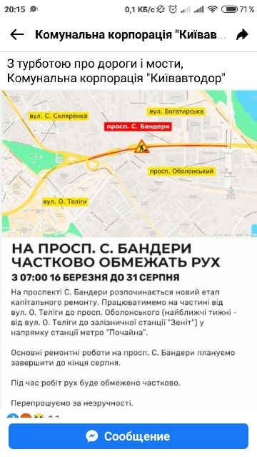 На проспекті С. Бандери триває другий етап капітального ремонту. Працюють на частині від залізничної станції "Зеніт" до вул. О. Теліги. У напрямку просп. Оболонського на цій ділянці уже встелили нижні шари покриття. Починають ремонтувати частину магістралі у напрямку вул. О. Теліги.