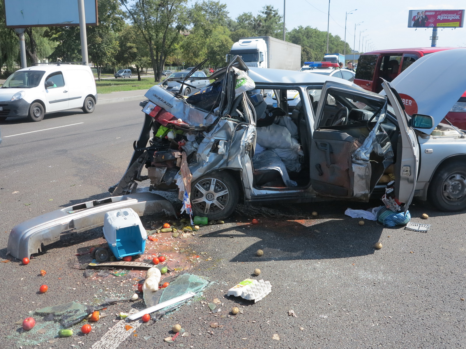25 августа в Киеве на Большой окружной дороге напротив дома 26 по улице Зодчих произошло столкновение сразу 5 транспортных средств: грузовика МАН, автомобиля ЛАДА, микроавтобуса Фольксваген, Опеля и Рено. Как удалось выяснить корреспонденту «ФАКТОВ», автомобили двигались в сторону проспекта Победы. Водители, двигавшиеся впереди, притормозили и это, похоже, стало неожиданностью для водителя грузовика. Он на полном ходу врезался во впереди приостановившеюся ЛАДУ. Удар был таким, что из плотно загруженной машины повылетали продукты. Мешок с картошкой оказался в нескольких метрах. Загруженный багажник принял на себя основной удар и по сути спас людей. В салоне ЛАДЫ было четверо взрослых и годовалый ребенок. После такого удара госпитализирована лишь одна женщина, остальные отделались сильным стрессом. Выяснилось, что водитель ЛАДЫ из Сумской области. Ехали к родственникам в Гостомель. Водитель грузовика возвращался из Киевской области в Житомирскую. Транспорт остальных участников этого ДТП поврежден не сильно, но понятно, что настроение и планы на выходные испорчены безнадежно.