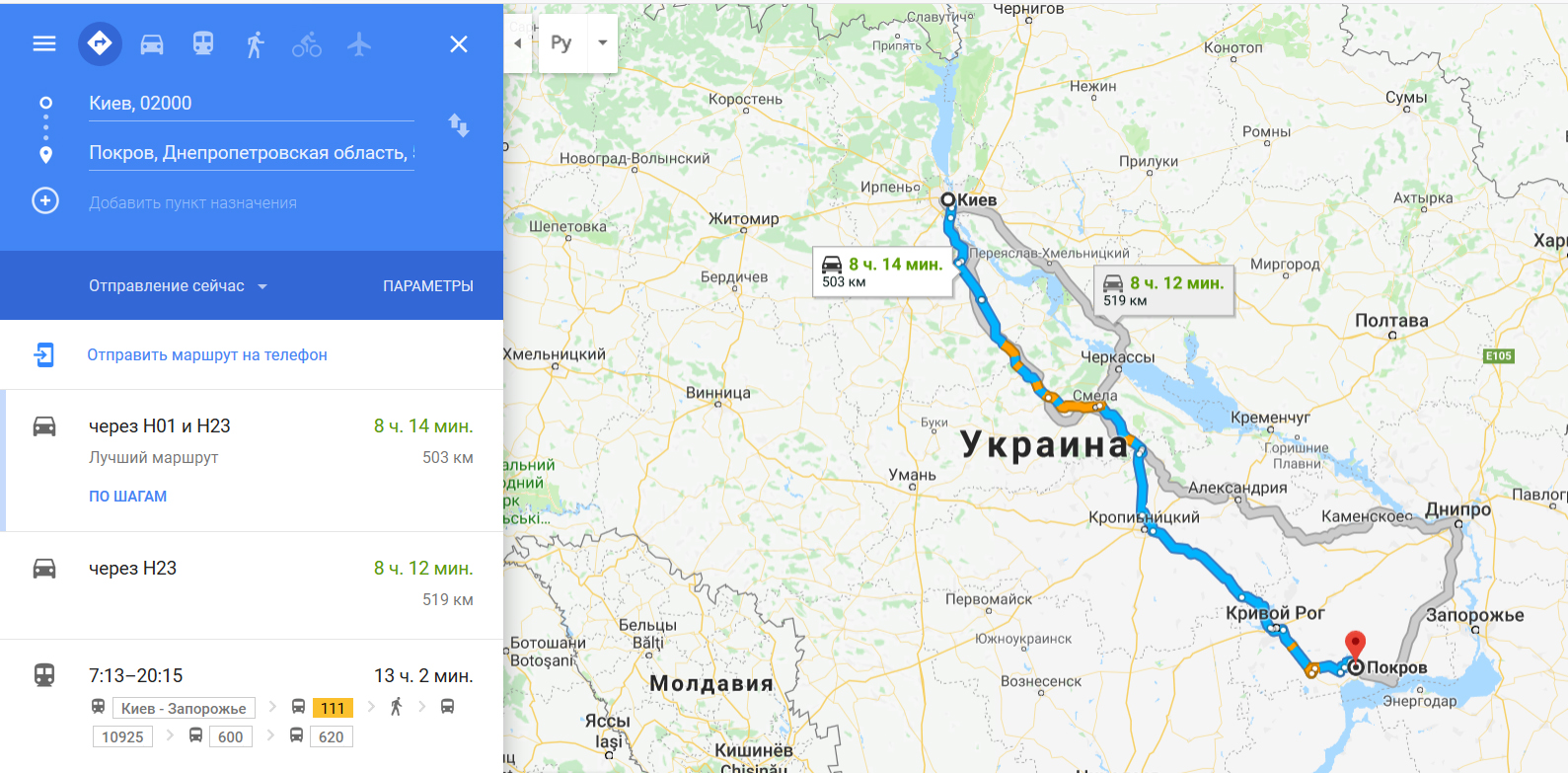 Киев - Орджоникидзе (Днепропетр. обл) каким маршрутом лучше. Туда - днем, обратно - ночью. Гугл пишет два маршрута по 8-9 часов примерно оба. Какой быстрее?