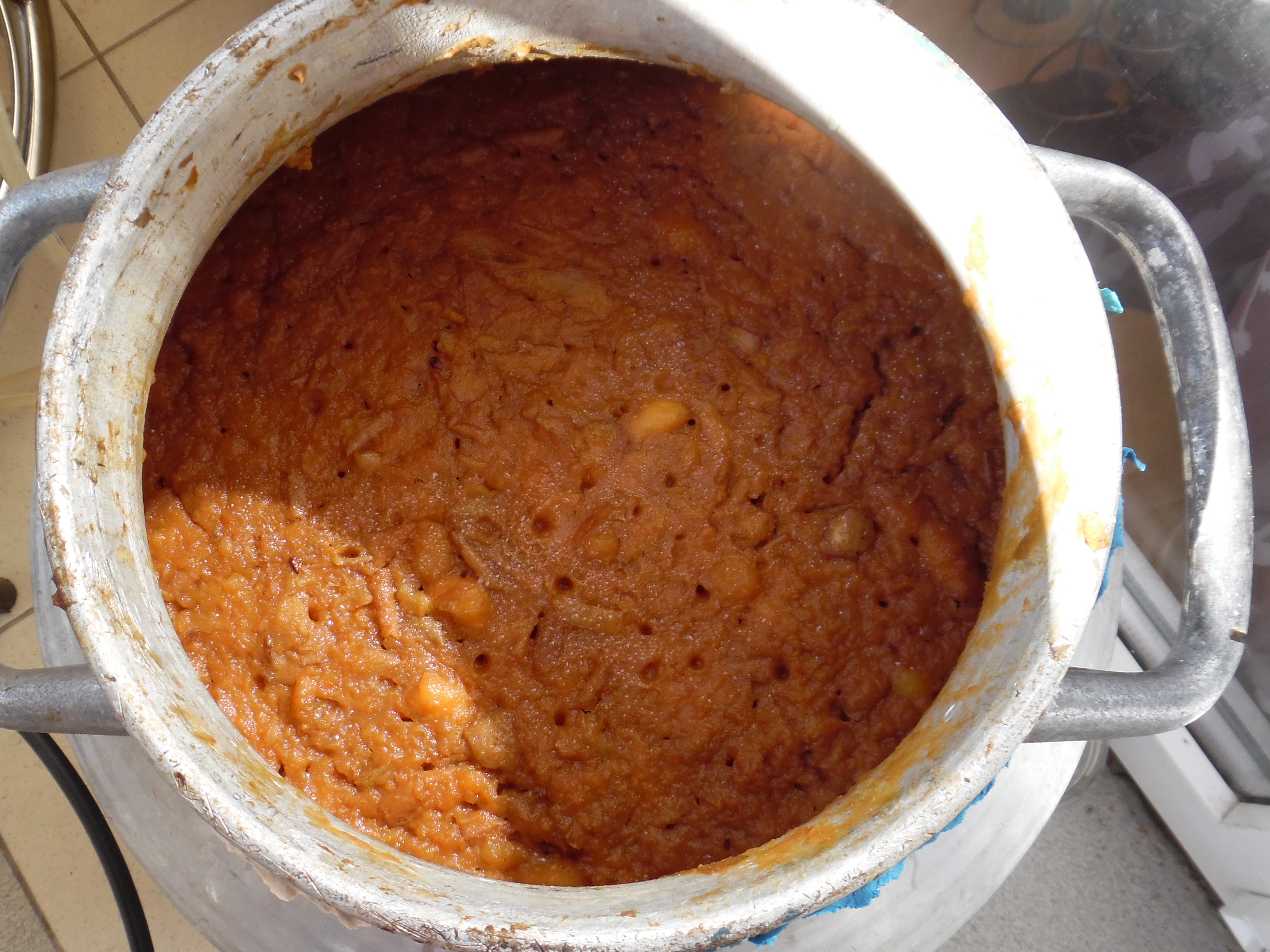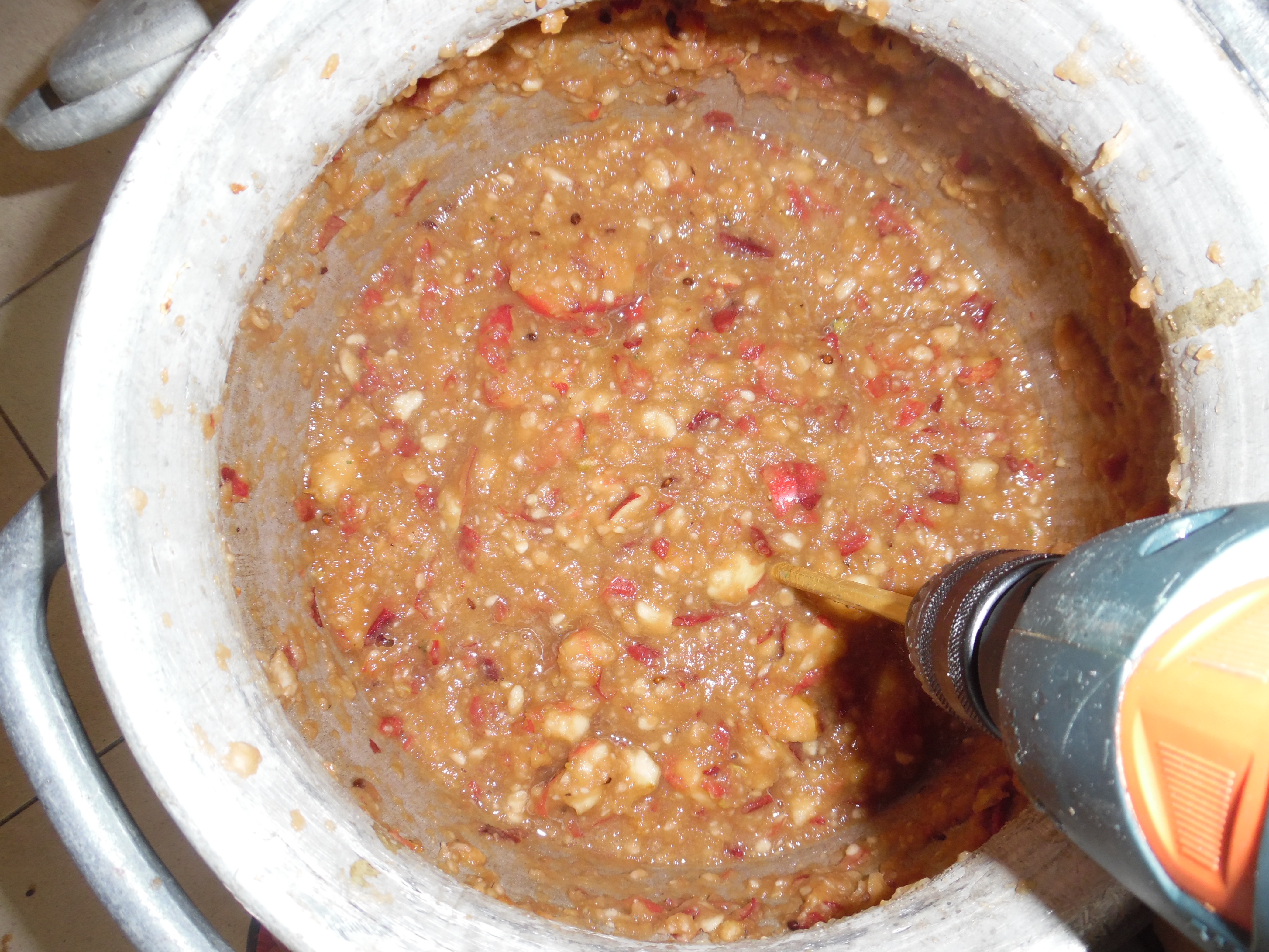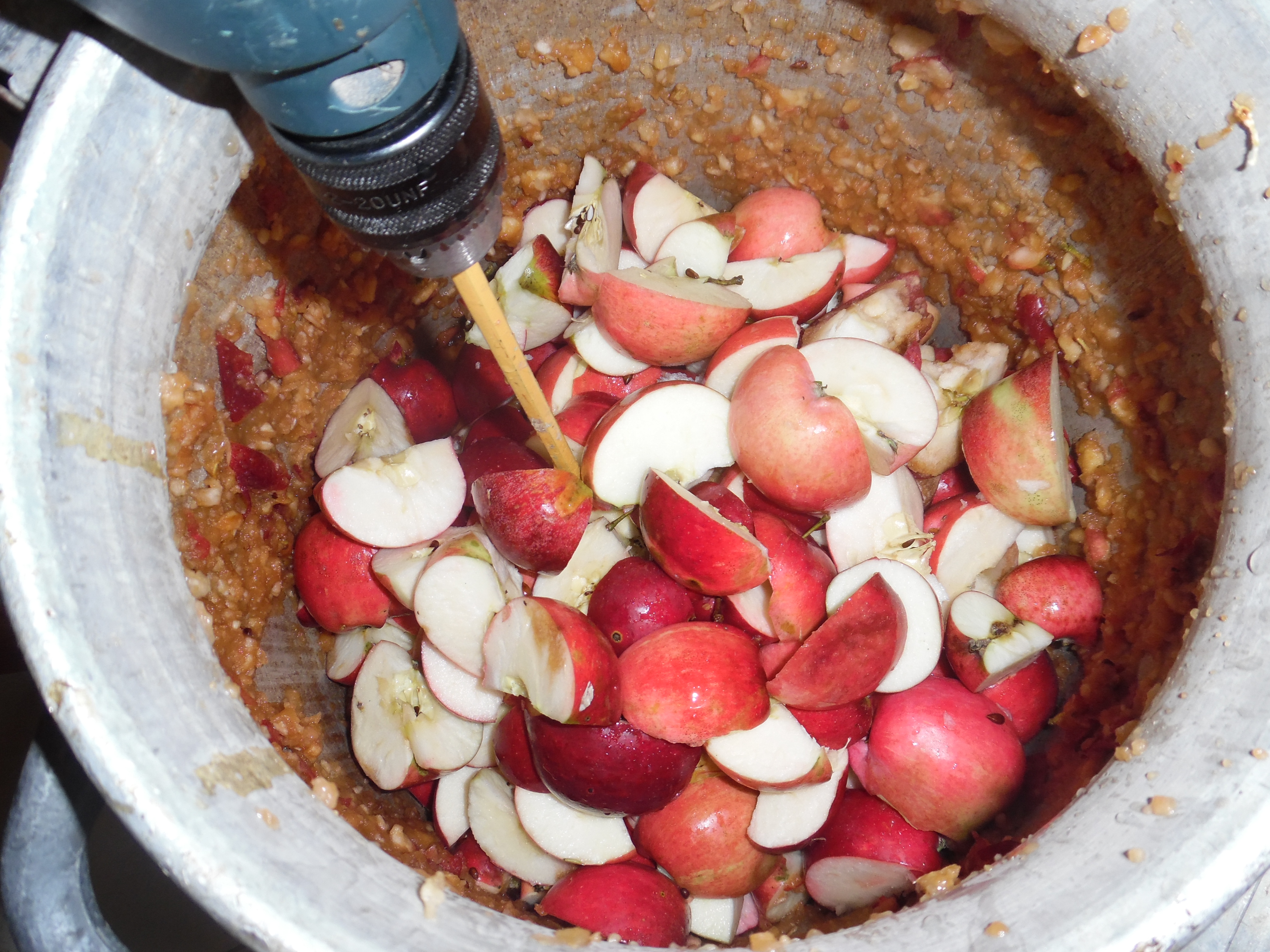Яблука дууже солодкі, м"які, навіть пухкі, але ніфіга не хочуть лежати - псуються! Довелося їх перемити, бо яблука з землі, порізав на четвертинки, викидав тільки хвостики, з гниллю не бавився - викидав ціле яблуко. Але проблема, що робити далі - не маю ні м"ясорубки, ні сокодавки, та й забава ця брудна і трудомістка. Вирішив перетовкти яблука будівельним міксером, вірніше насадкою на дрель. Результат офігенний, швидко і невимушено яблука перетворювалися на пюре типу дитячого, я тільки підкидав свіжих і долив трошки води(може і не слід було). Єдине, робив це в алюмінієвому бідоні, а не в пластиковій бочці.