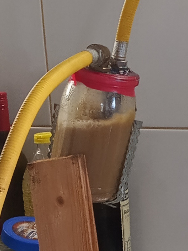 Так як яблука я помив, трошки переживав, як воно розбродиться. На слідуючий день ця вся маса піднялась, але якось в"яло. Думаю,ще скисне до бісової мами, але якраз в той день знімав мєзгу зі сливки, відкинув її на сіто, а бражку, що стекла з мєзгі, десь до 200 грам, хляпнув в яблуківку. Поставив під гідрозатвор, через пару годин випадково помітив - через ГЗ пре брага!! Відкриваю бідон - поперло, сподобалось яблучко сливовим дикарям! Злив 5 літрів у бутлю, закрив: через годину знов то саме, знов злив 5 літрів, нарешті вгамувалося. Бутлі поставив під шарики,будуть мені як маркери, решту браги пару раз на день підтоплюю, стоїть на балконі, бродить непогано, але на смак цукор зменшується,але бражка некислить, і не гірчить, х.з., куди той цукор дівається, може те, що я пробую шапку, а воно нижче, кароч, подивимся, поки що так:
