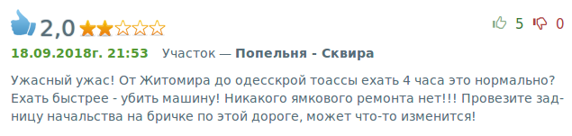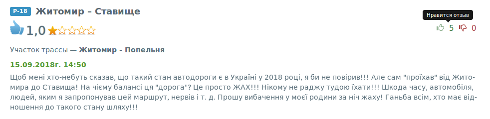 Как хорошая альтернатива Фастов-Попельня-Житомир. Очень плохо только в самой Кожанке около 2-х км. Зато Кожанка-Кожляки это просто автобан. 130 легко. Попельня-Волиця мелкие незаделанные ямы, критичных нет. Волиця-Житомир вполне нормально. Хороший ямочный ремонт.