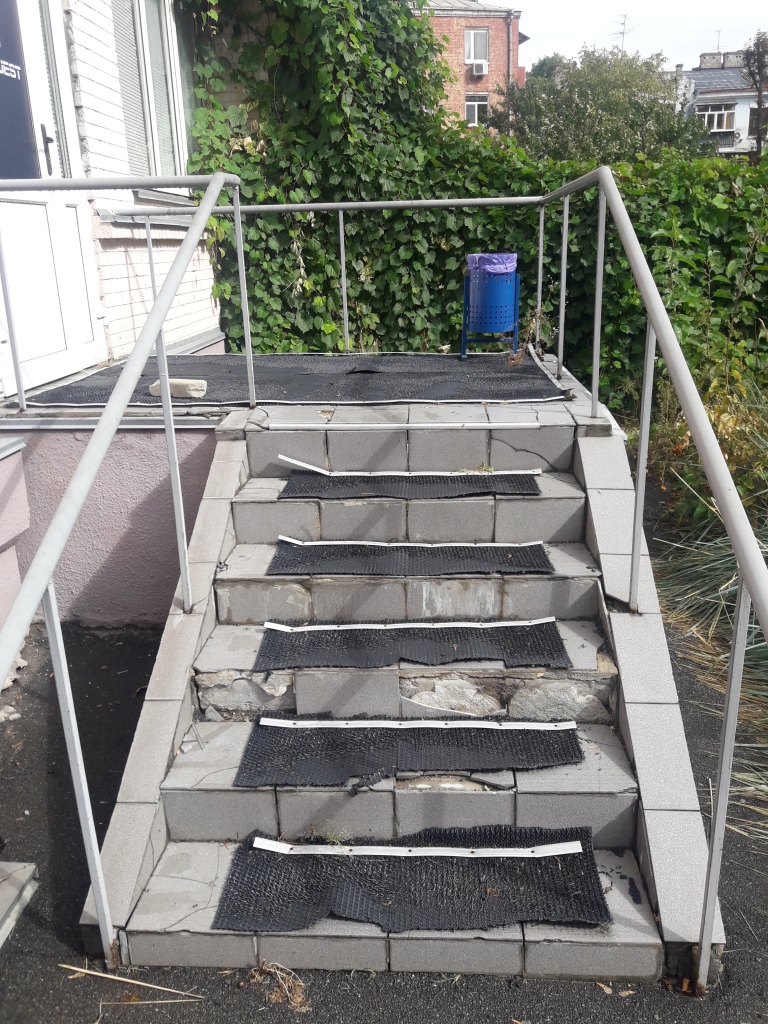 Когда будете менять, киньте туда кабельный подогрев, чтобы крыльцо и вид имело, и безопасней было. Сейчас это недорого, а это офис все ж таки.