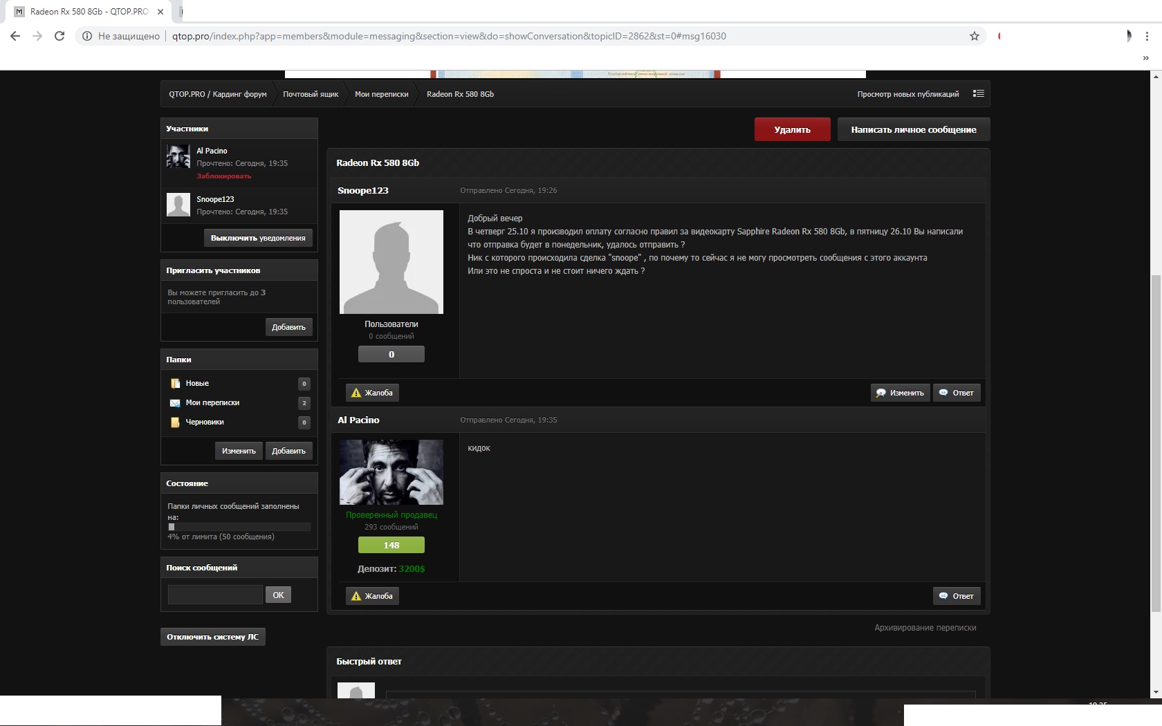 Мошенники на кардинг форуме http://qtop.pro После отправки денег гаранту, блокируют аккаунт, и всё что написано там - бутафория, управляет этим аккаунтом один или несколько лиц, т.к. при обращении к продавцу с вновь созданного аккаунта, написали прямо что это кидок и удалили аккаунт (скрин прикреплён)