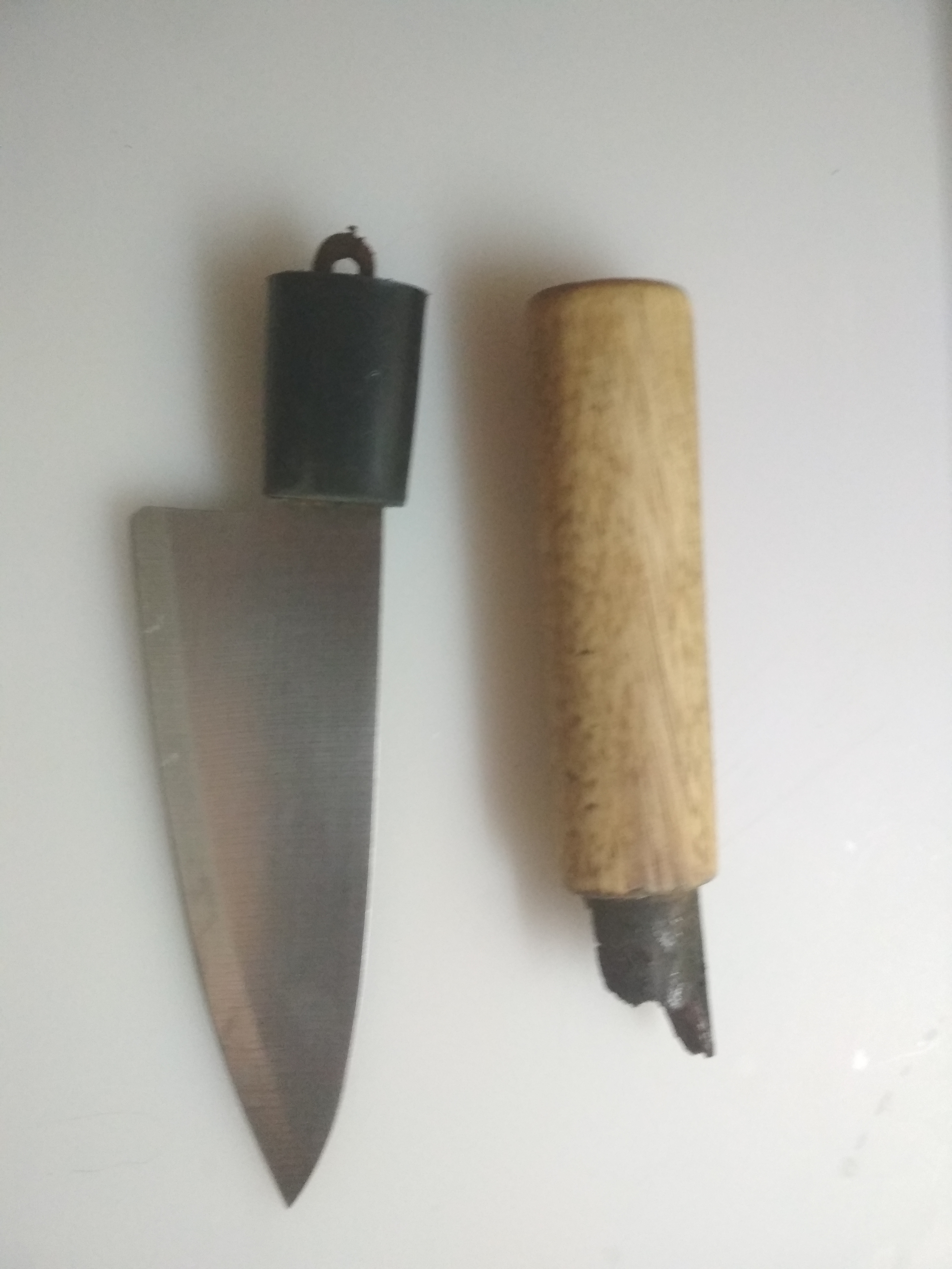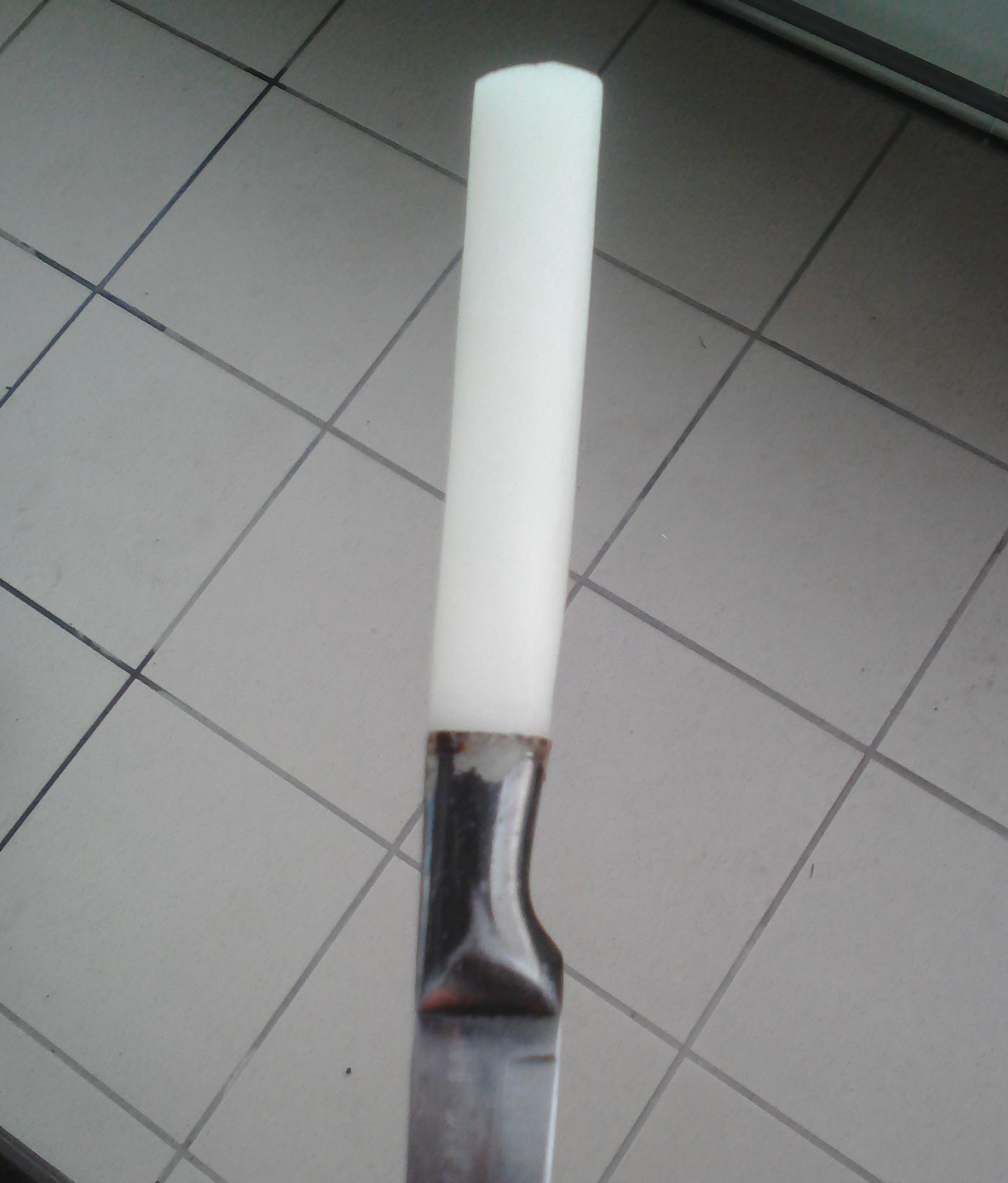 Ручка делается лехко. Обматываешь то черненькое бумагой, пропитанной воском, чтобы получилась трубка нужной длины. И заливаешь эпоксидкой. Можешь туда подложить гвоздь чтобы армировать. Но если тебе кости им не рубить, достаточно и прочности эпоксидки. Все щели залепи скотчем, потому что когда зальешь и оставишь застывать вертикально, начнет сочиться. Заливай очень медленно, чтобы пузыри не образовались, потом какой-то спицей пошуруй.