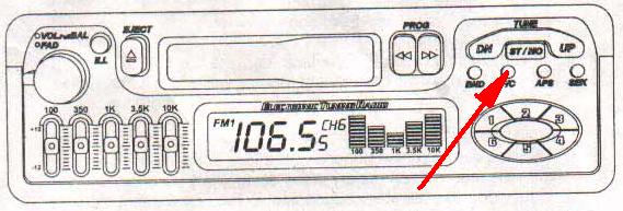 Магнитола показана на рисунке. Кнопка указанная красной стрелкой позволяет переключать дисплей в режим часы или наоборот в режим радио (отображение частоты)