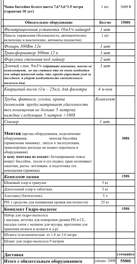 Итак: по результатам общения с десятками продавцов сделал вывод: большинство из них хотят продать один бассейн в сезон лоху и больше ничего не делать до сл. года. По факту: нашёл одного производителя, по случайности оказавшийся квартирантом моего кума. Который максимально доходчиво и аргументированно объяснил все схемы развода лоха на деньги. Итого чаша с оборудованием и установкой/наладкой выходит 5500$. Земляные работы ещё думаю 1-1,5. Итого бассейн 7,6*3,6*1.5 метра думаю выйдет 7-7,5$