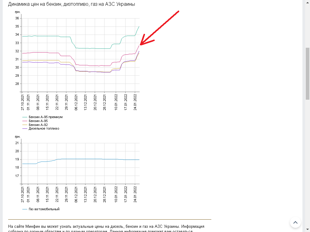 Скриншот со стрелкой цен на бензин. Ниже цены на газ.